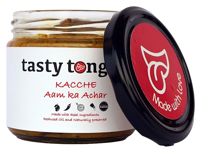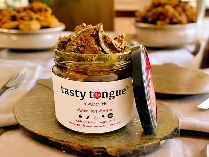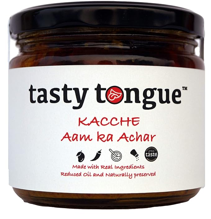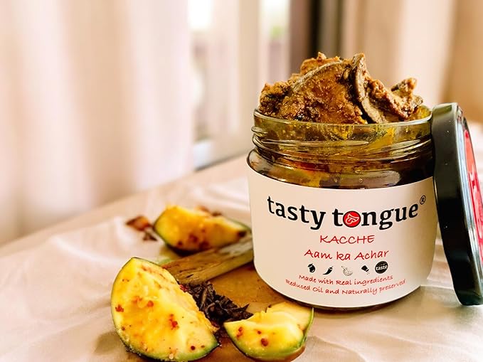 Bring home the tangy magic of tasty tongue Kachche Aam Ka Achar.Made from juicy raw mangoes, spiced with traditional Indian masalas.Each bite bursts with bold flavors and a perfect balance of sour and spice.Crafted using a time-honored recipe, just like grandmas kitchen.Perfect sidekick to your everyday meals from parathas to rice.No artificial preservatives just pure, homemade-style goodness!