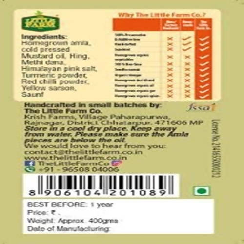 The Little Farm Co Amla PickleAmla pickle is considered to be a healthy condiment because it contains all the dietetic benefits of amla, which is one of the healthiest and most nutritious herbal products from India. Amla is enriched with high vitamin C content which is very important for overall health improvement.Ingredients:Homegrown Amla, cold-pressed mustard oil, hing, methi dana, Himalayan pink salt, turmeric powder, red chilli powder, yellow sarson, saunfLegal Disclaimer: Product images are for illustrative purposes only. Images/packaging/ labels may vary from time to time due to changes made by the manufacturer's manufacturing batch and