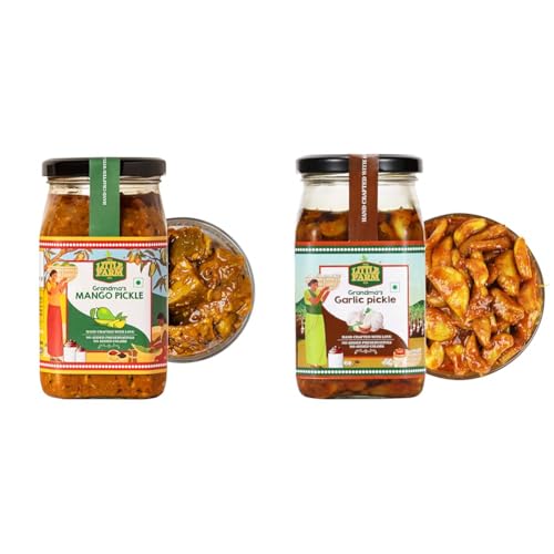 HomeGroceryFlavorsHomemade PicklesTHE LITTLE FARM CO Punjabi Mango Pickle - Aam ka Achar | Mango Pickles with Saunf 400g and Garlic Pickle - Lehsun ka Achar | Less Oil Mustard Base Homemade Garlic Pickles with Jaggery 400g