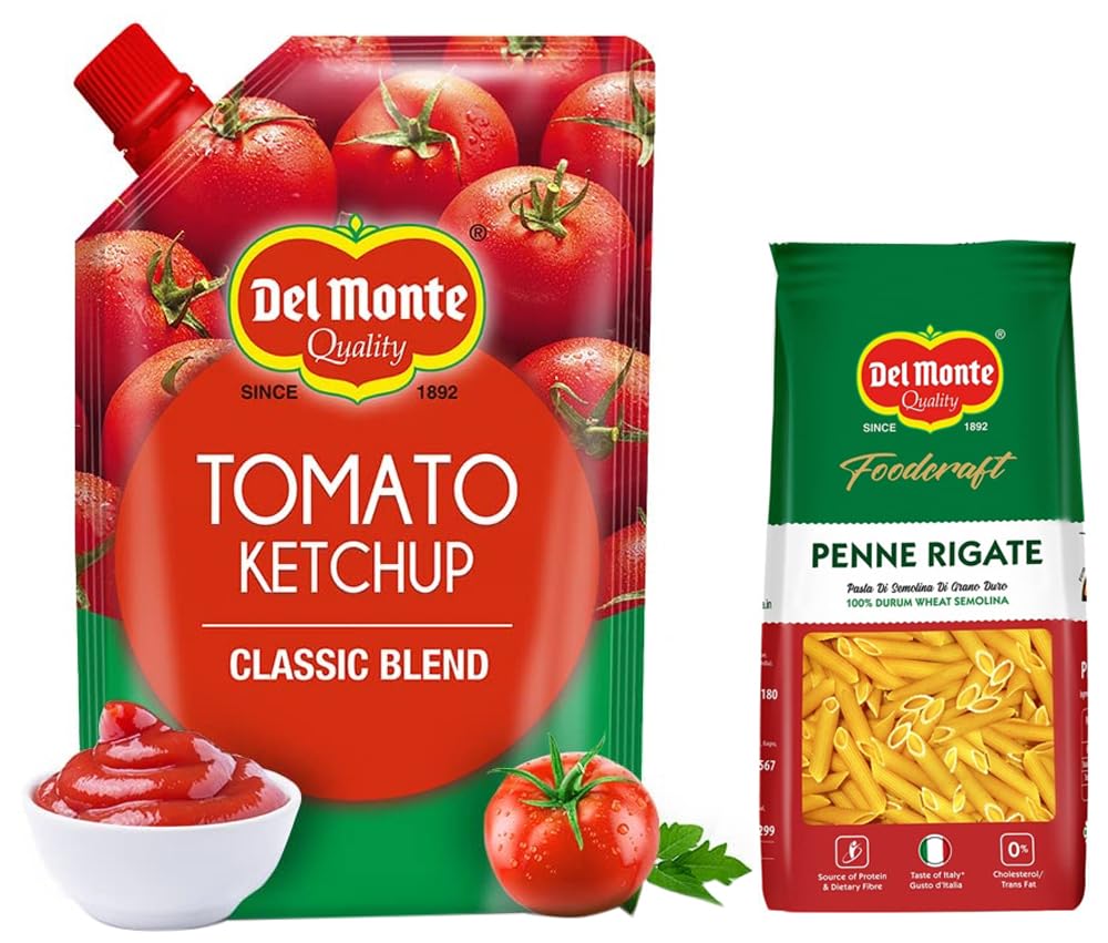 Del Monte Tomato Ketchup - Classic Blend 900g/950gDel Monte Tomato Ketchup uses Quality Vine Ripened Tomatoes. Each batch of Del Monte Tomato Ketchup is carefully processed with premium ingredients and under goes stringent quality checks to ensure product superiority. Like diversity of Indian cuisines Del Monte Tomato Ketchup can be used diversely- as a condiment ingredient or a dip in any of the cuisinesDel Monte Foodcraft Penne Rigate Pasta (100% Durum Wheat - No Maida) 500 gramsMade using fine quality durum wheat semolina it is ideal for a quick snack as part of a healthy salad in kids’ tiffin-boxes or a complete meal for the family.