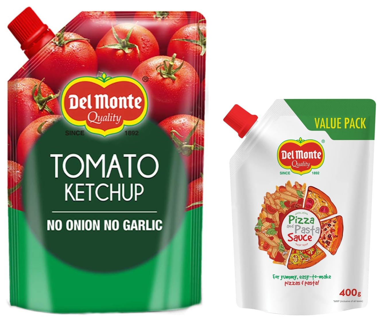 Del Monte Tomato Ketchup No Onion No Garlic Pouch 900 gMade with high quality vine-ripened tomatoes. De monte tomato ketchup goes through a systematic process to give you a rich textured ketchup perefcted for a lip smacking taste.Del Monte Pizza & Pasta Sauce Spout Pack 400gRich flavourful and multi-purpose pizza and pasta sauce to whip up delectable pizzas and pasta right in your kitchen! Now in an easy-to-handle spout pack that offers great convenience and value-for-money.