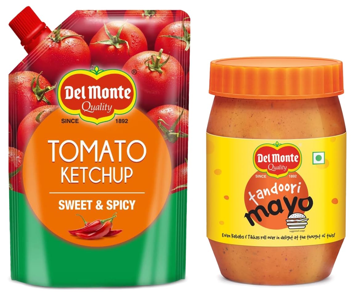 Del Monte Tomato Ketchup Sweet and Spicy Pouch 950 gMade with high quality vine-ripened tomatoes. De monte tomato ketchup goes through a systematic process to give you a rich textured ketchup perefcted for a lip smacking taste.Del Monte Tandoori Mayonnaise 285gDel Monte Mayo is made with carefully selected quality ingredients which gives it a smooth and thick texture coupled with rich and creamy taste