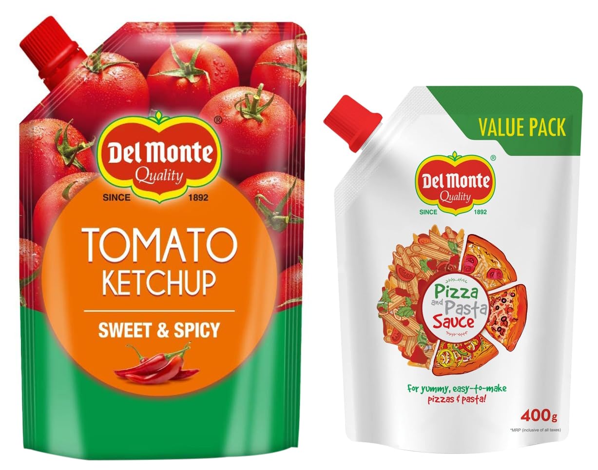 Del Monte Tomato Ketchup Sweet and Spicy Pouch 950 gMade with high quality vine-ripened tomatoes. De monte tomato ketchup goes through a systematic process to give you a rich textured ketchup perefcted for a lip smacking taste.Del Monte Pizza & Pasta Sauce Spout Pack 400gRich flavourful and multi-purpose pizza and pasta sauce to whip up delectable pizzas and pasta right in your kitchen! Now in an easy-to-handle spout pack that offers great convenience and value-for-money.