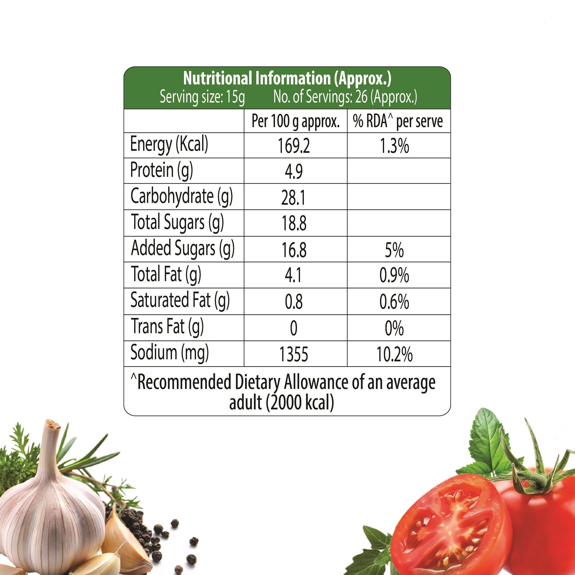 Material Features: Vegetarian ; Item Form: Paste ; Ingredients: Tomato Paste (41%) Water Onions Liquid Glucose Sugar Edible Vegetable Oil Iodized Salt Spices & Condiments {Garlic Powder (0.97%) Mixed Spices Red Chilli Flakes (0.25%) & Red Paprika (0.19%)}