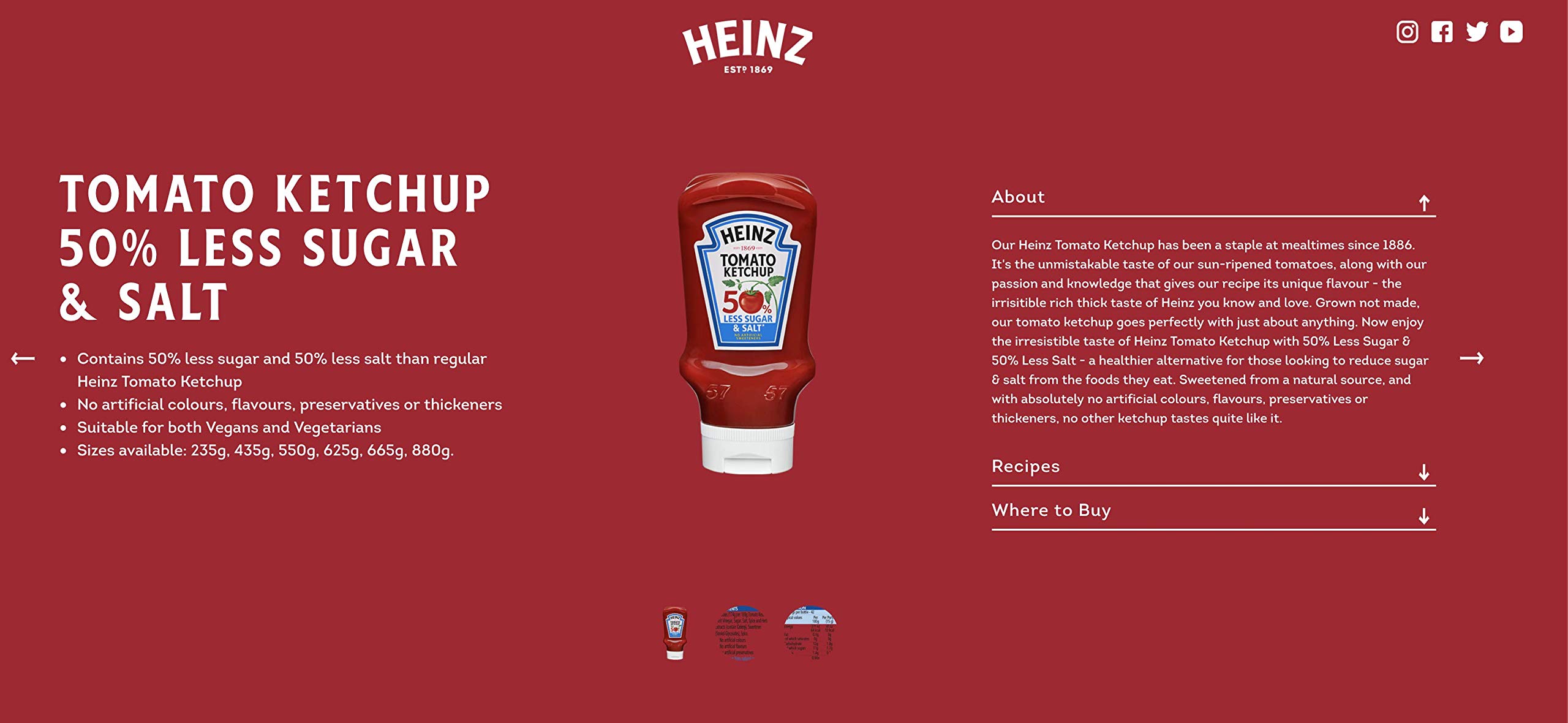 Tomato Ketchup with Sugar and Sweetener Check out our tomato ketchup recipes at Heinz.co.uk Try No Added Sugar & Salt or Organic Tomato Ketchup - all with the irresistible Heinz taste you know and love! Our Heinz Tomato Ketchup has been a staple at mealtimes since 1886. It's the unmistakable taste of our sun-ripened tomatoes along with our passion and knowledge that gives our recipe its unique flavour - the irrisitible rich thick taste of Heinz you know and love. Grown not made our tomato ketchup goes perfectly with just about anything. Now enjoy the irresistible taste of Heinz Tomato Ketchup with 50% Less Sugar & 50% Less Salt - a healthier alternative for those looking to reduce sugar & salt from the foods they eat. Sweetened from a natural source and with absolutely no artificial colours flavours preservatives or thickeners no other ketchup tastes quite like it. Contains 50% less sugar and 50% less salt than regular Heinz Tomato Ketchup Sweetener from natural source Perfect with a burger & chips or even a flame grilled chicken breast & side salad Absolutely no artificial colours flavours or preservatives Allergy Information Lifestyle Kosher Kosher Pack Quantity 235g â® Allergy Statement Artificial Colours - Free From Artificial Flavours - Free From Artificial Preservatives - Free From Artificial Colours - Free From Artificial Flavours - Free From Artificial Preservatives - Free From Usage Text Servings per bottle - 15 Usage Count 15 Servings Preparation and Usage Before use open cap and remove foil. Shake well before use. Storage Type Ambient Return To H.J. Heinz Foods UK Ltd. Hayes Middx UB4 8AL United Kingdom. UK careline 0800 5285757 (ROI 1800 995311) Name and Address: H.J. Heinz Foods UK Ltd. Hayes Middx UB4 8AL United Kingdom. Ingredients Tomatoes (174 g per 100 g Tomato Ketchup) Spirit Vinegar Sugar Salt Spice and Herb Extracts (contain Celery) Sweetener (Steviol Glycosides) Spice