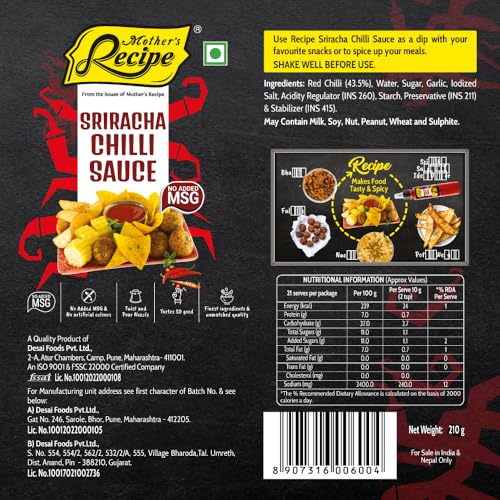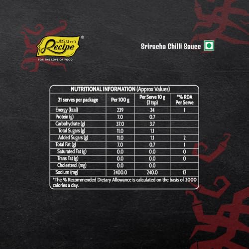 The Mothers Recipe Sriracha Chilli Sauce is the perfect condiment to make your food hot and spicy. This Sriracha Chilli Sauce is made with hot red chillies and is known to be one of the hottest chilli sauces and is perfect for those who like their food hot and spicy.