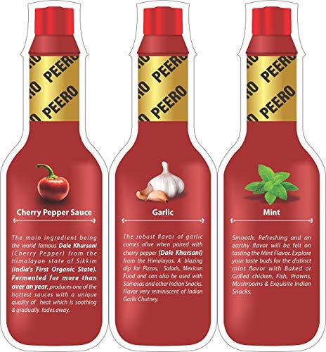 Red Cherry Pepper SauceThe main ingredient being the world famous Dale Khursani (Cherry Pepper) from the Himalayan state of Sikkim(India's First Organic State). Fermented for more then over a year produces one of the hottest sauces with an unique quality of the heat gradually soothing & fading away.MintSmooth , Refreshing and an earthy flavor will be felt on tasting the Mint Flavor, Enrich your taste with using it in Indian Snacks. Great with Baked/Grilled chicken, fish, prawns and Mushrooms.GarlicThe robust flavour of garlic comes alive when paired with cherry pepper( Dale Khursani) from the Himalayas, This is a biting hot sauce and a must have with Pizzas, Dressing , Salads. Also can be used with Indian Samosas, Kachori and Starters. flavour very reminiscent of Indian Garclic Chutney.