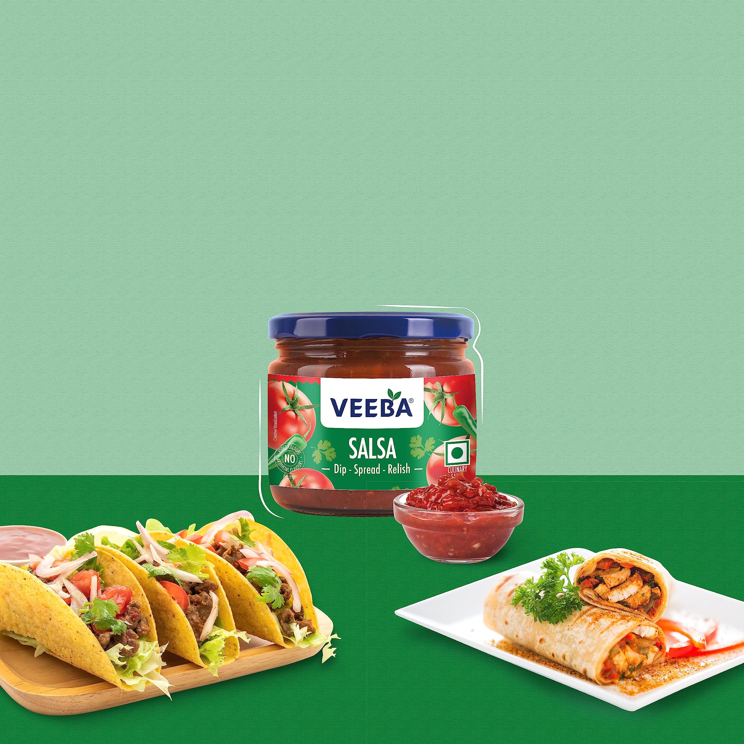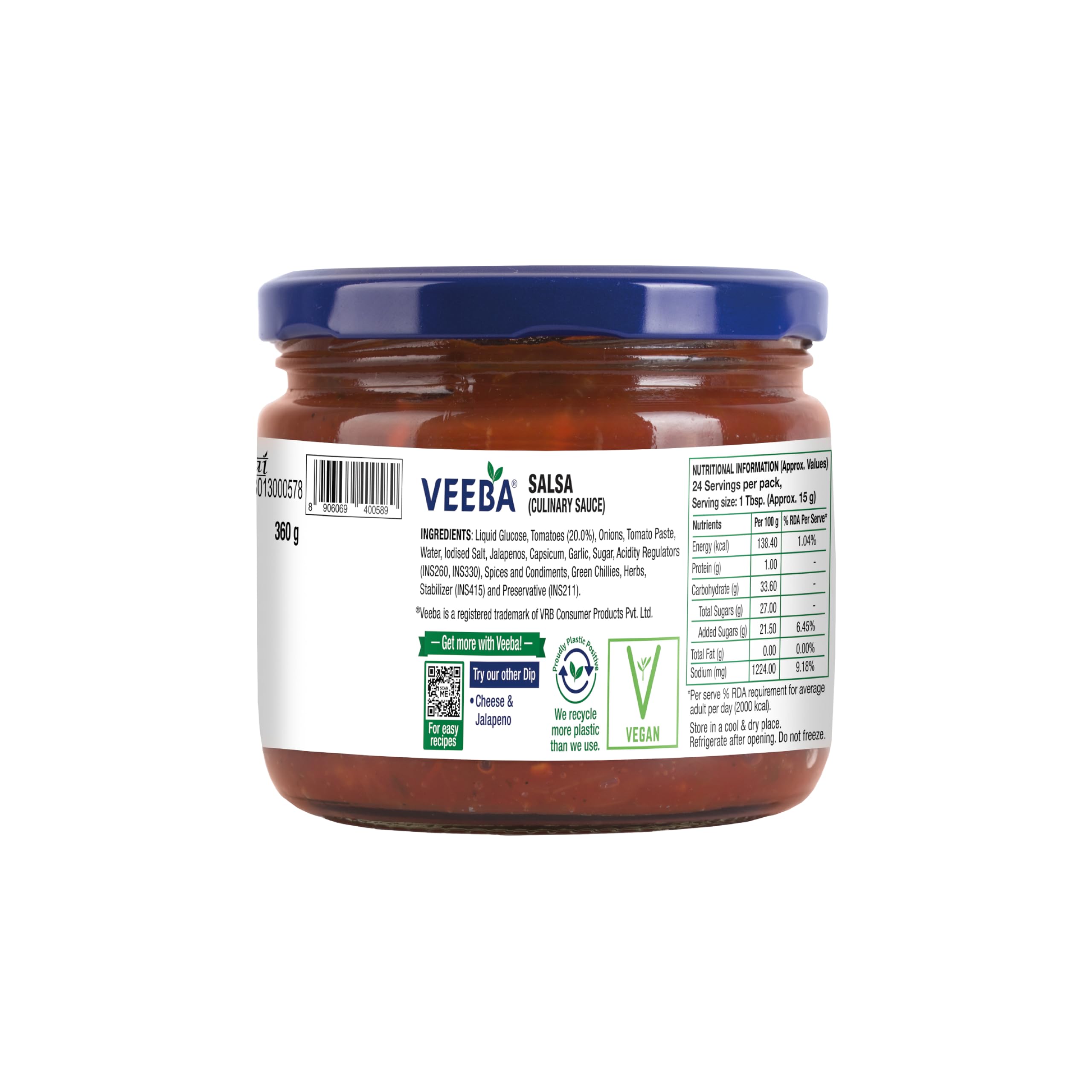 Veeba brand salsa dip is really good.quality and quantity is perfect.taste and suger content is perfect.good fragrance.its healthy and natural ingredients product.i suggest one time must be try...