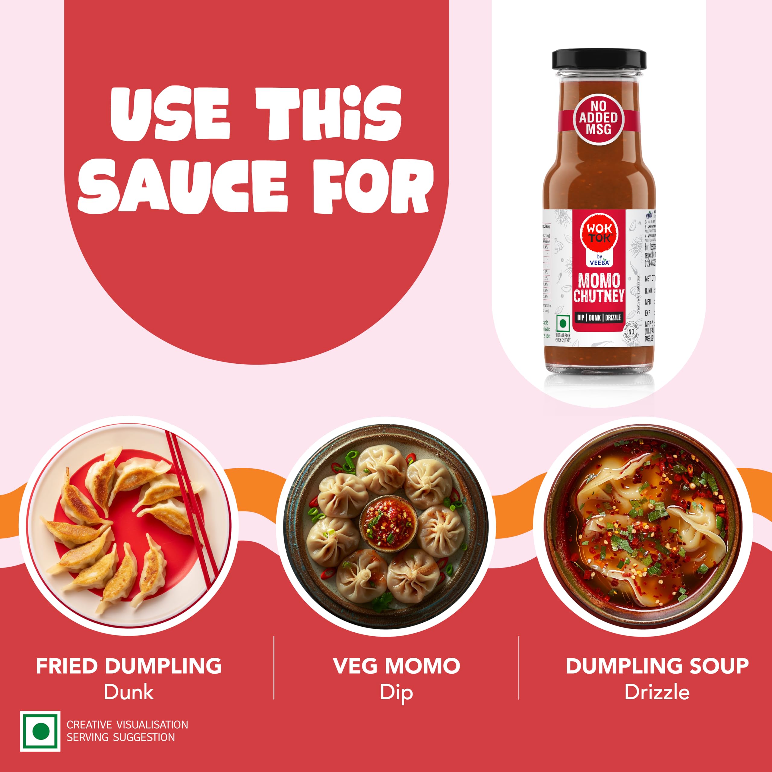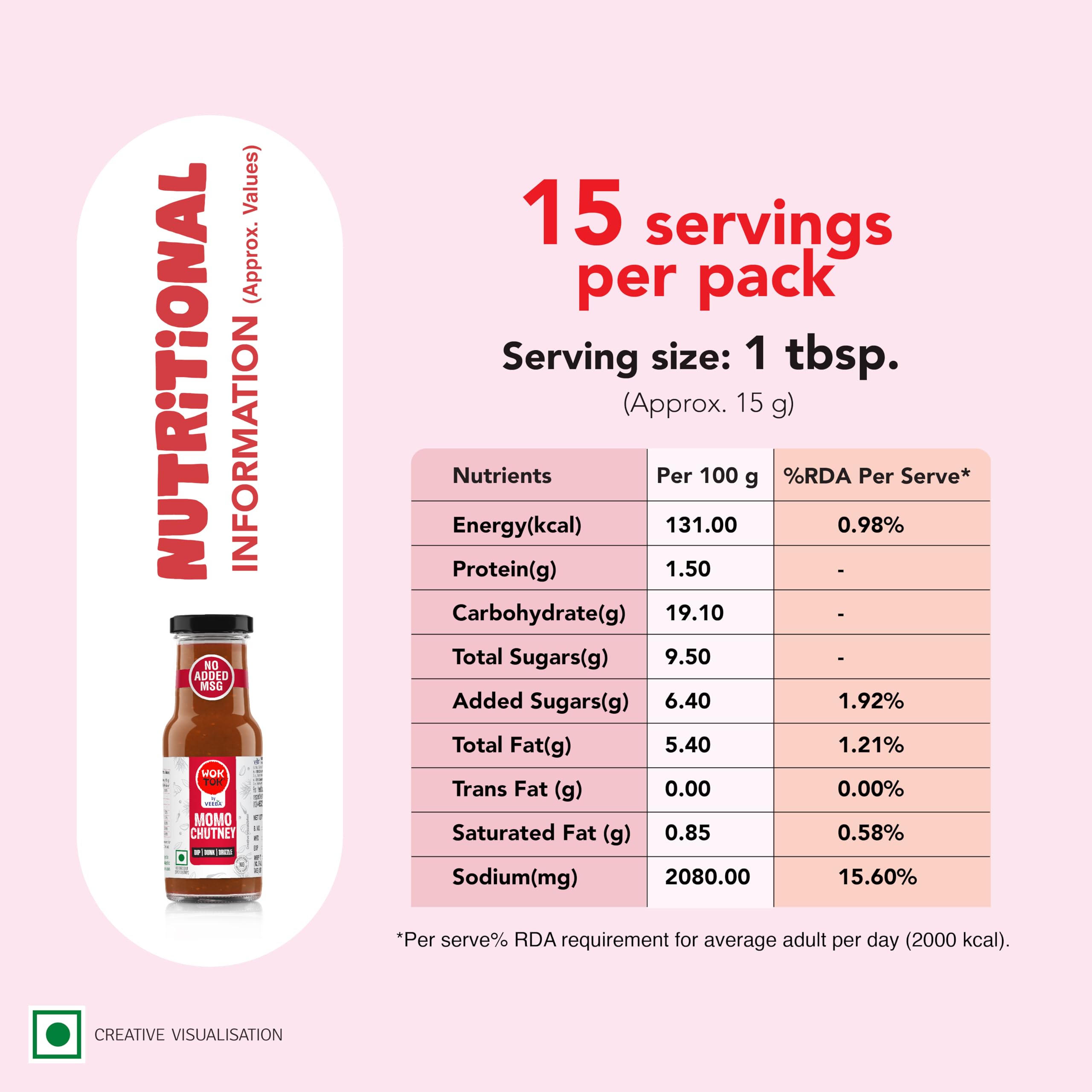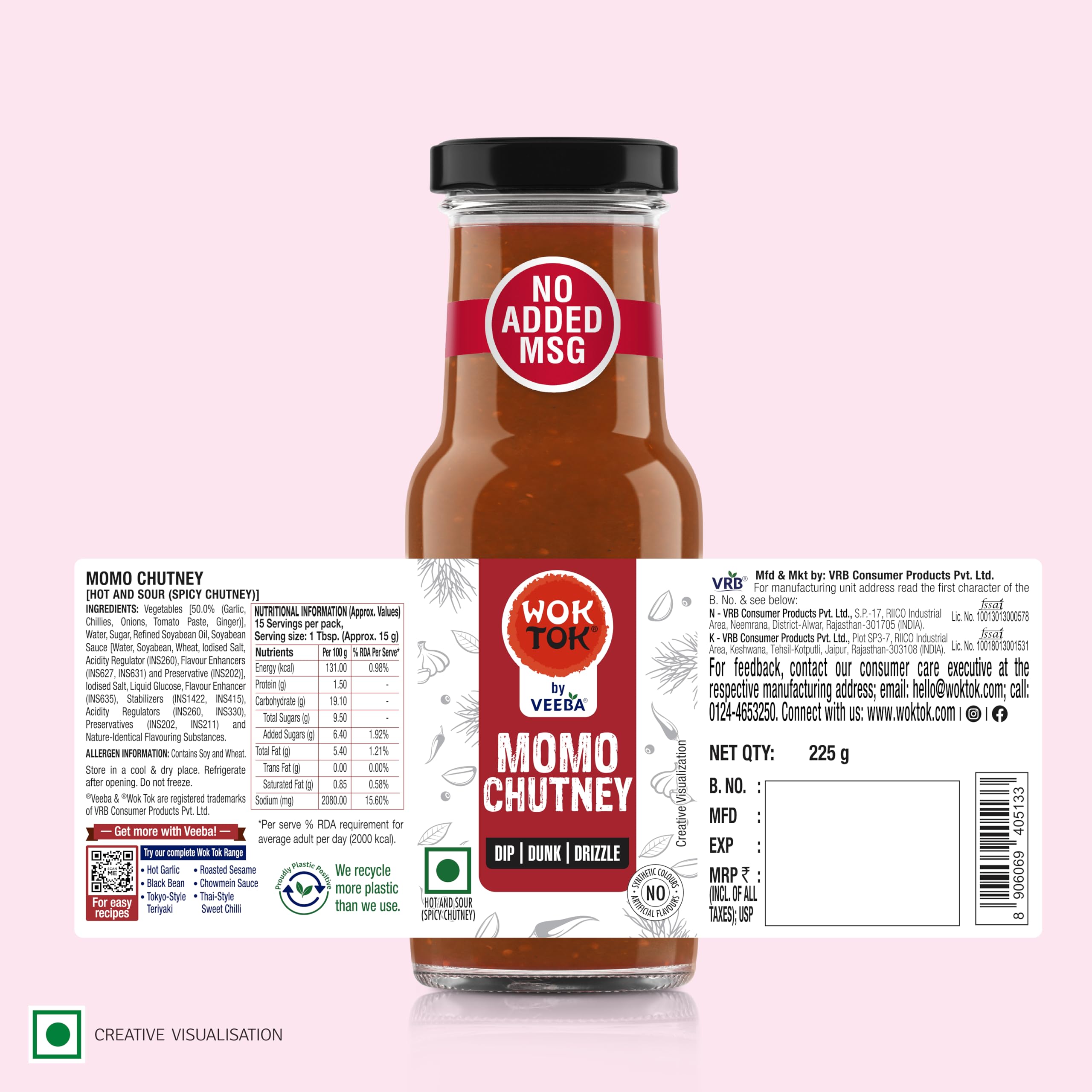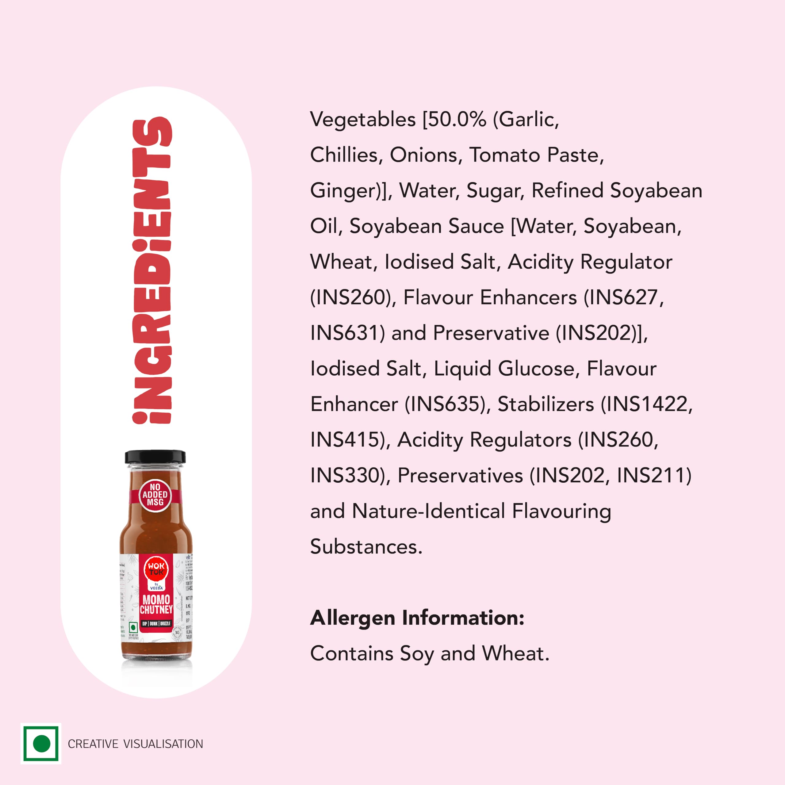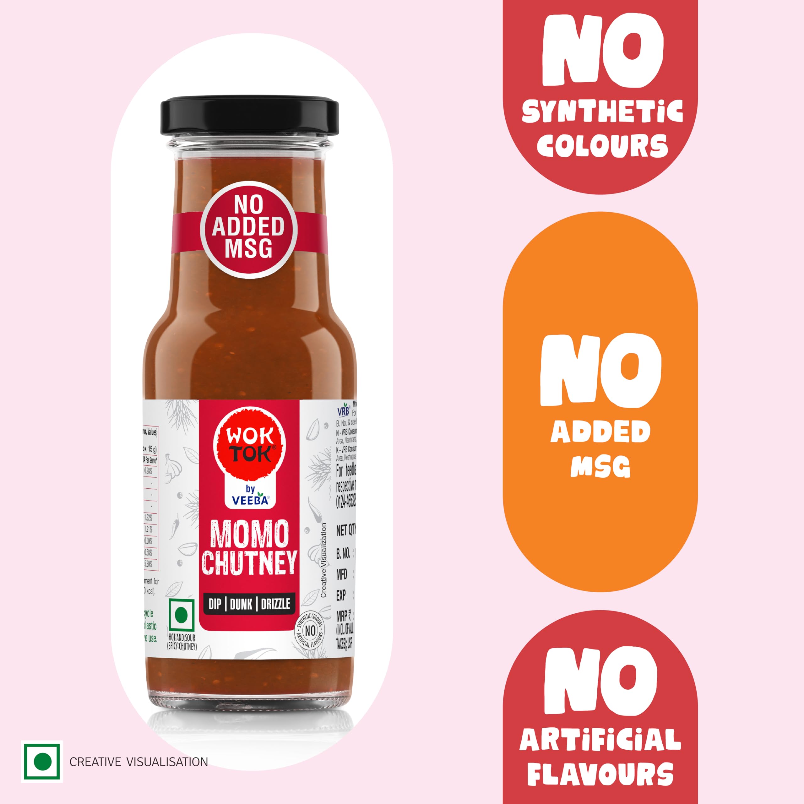 Elevate your snacking experience with Wok Tok Momo Chutney a fiery blend of chillies aromatic garlic and ginger. This chutney perfectly complements the Indian palate while delivering a delicious taste that's both bold and balanced. The rich tomato base adds a tangy depth making every bite an explosion of deliciousness. Enjoy the gritty texture that enhances its rustic appeal while savouring the goodness of a chutney made without added MSG and with zero trans fat. It's perfect for those who crave a spicy kick in every dip!