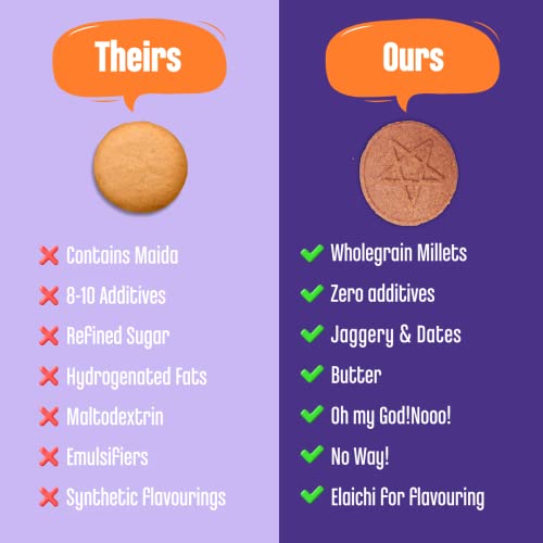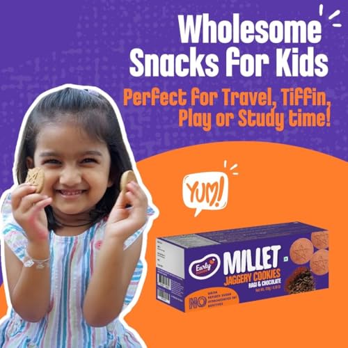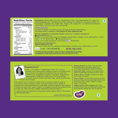 Recommended for little ones who are ready for all grains & nuts. Best if they have 1-2 teeth to chew. If not you can always dip in milk to help them bite. These Ragi biscuits are made from organically certified whole wheat millets pulses Organic Jaggery Indian grown cacao powder superior quality dry fruits & seeds that add natural vitamin and mineral supplements to your child's diet. 2 Assorted Packs. Contains ~18-20 pieces each. How are Early Foods Cookies Different & Special? - Freshly prepared batch of jaggery biscuits for little ones & grownup's once you order online. Because children need freshly made foods for maximum nutrient absorption - Made from Organically Certified Whole Grains and 0% Maida - No Baking Powder No Soda No Raising Agents No Egg - 0% Sugar Sweetness from Organic Jaggery and Dates - No hydrogenated fats. Made from pure cow butter. - No Preservatives or Artificial Flavours Ingredients: Organic Whole Grains (Ragi Amaranth Wheat) Cow Butter Organic Jaggery Dry Fruits (Almonds Pista Cashews Dates Walnuts Watermelon Seeds Sunflower Seeds) Organic Raw Cacao Powder Milk. Shelf Life: Best before 4 months from MFD. Consume before 1 months from opening the pack. Best to store in a dry steel or glass air tight container. Why Moms love Early Foods: - Made from ancient Indian Super Foods - We make really small batches of food each day. So you can always feed super fresh meals. - Grandma inspired recipes simple healthy with minimal processing - No Sugar or salt. - No Preservatives colours or artificial flavours. All Natural