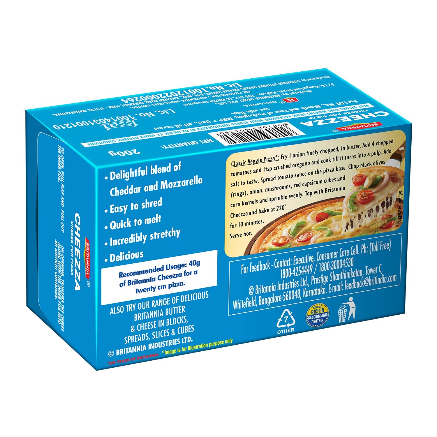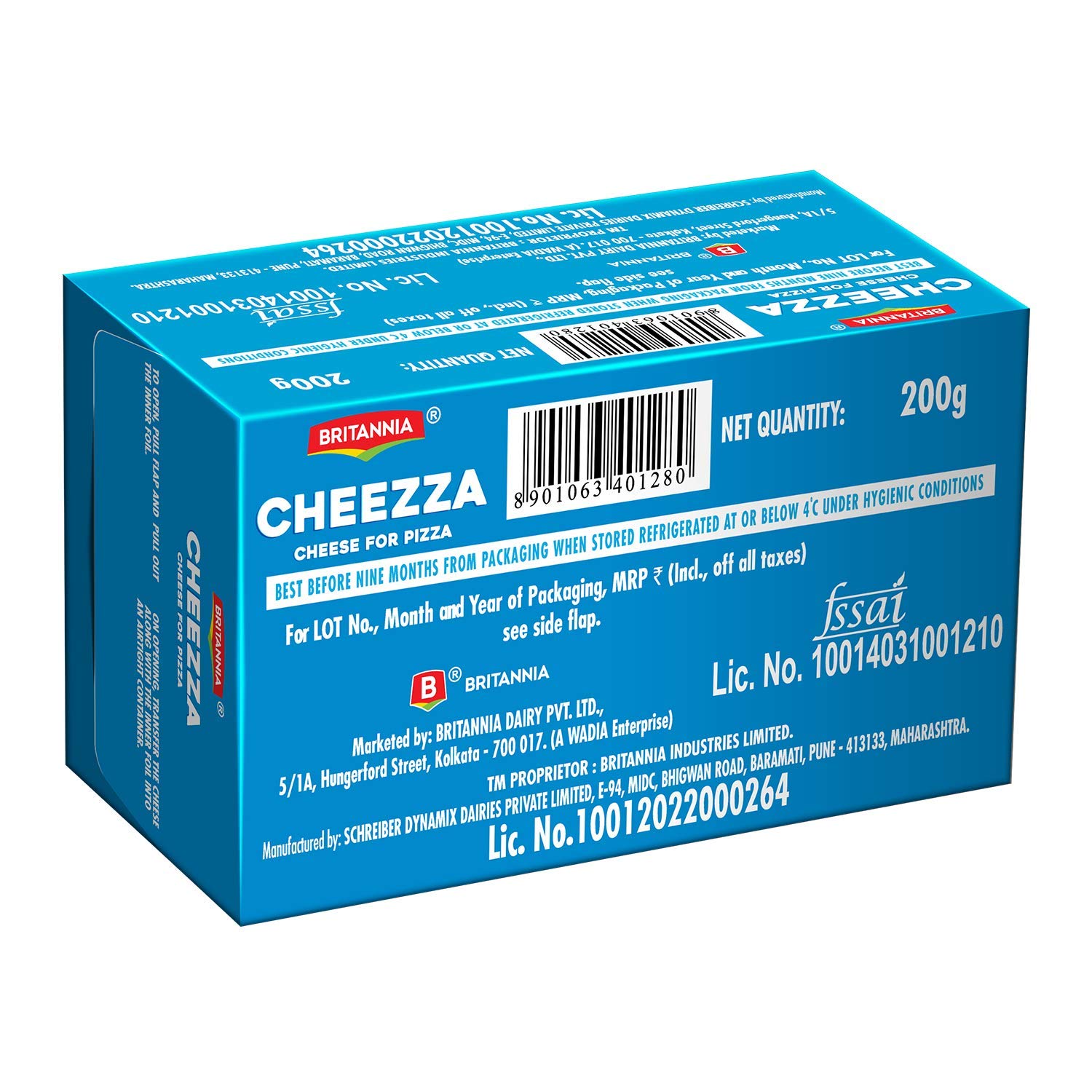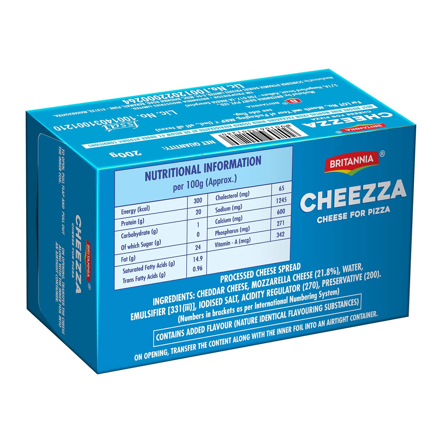 Britannia Cheezza made with the goodness of cow's milk is a perfect blend of cheddar & mozzarella cheese. Grate it spread it & melt it for a rich cheesy & flavorful pizza. Britannia Cheezza is the perfect partner for your yummy pizza. Believing in delivering fresh and healthy products Britannia manufactures some of India's widest range of cheese- slices cubes blocks spreads pizza cheese and much more.
