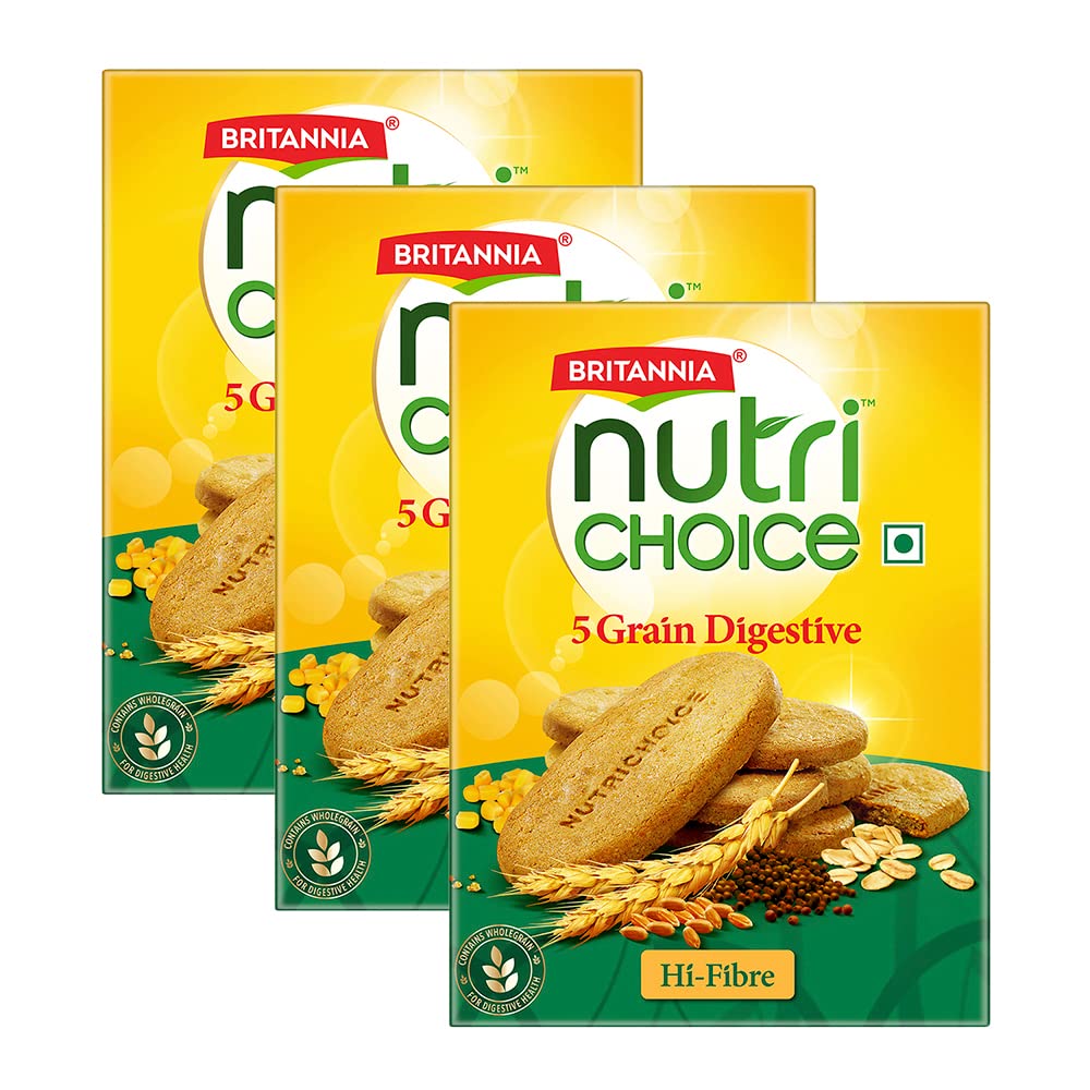 Britannia NutriChoice 5 Grain Digestive are multigrain high fibre healthy biscuits that include Oats Ragi Wheat Corn and Rice. This healthy snack is fibre rich and has the goodness of honey. This uniquely shaped biscuit serves as a perfect healthy snack that is also extremely filling.