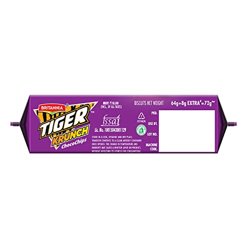 Britannia Tiger Krunch Chocochip Biscuits are sprinkled with the yummy choco chips. The crunchiness of biscuits when combined with the delighting flavour of chocolate creates a biscuit so delicious. Britannia biscuits and cookies for long has been a part of every home sharing those moments of joy. Believing in delivering fresh and healthy products Britannia India manufactures some of India's favourite brands like 50-50 Tiger NutriChoice Bourbon Good Day Milk Bikis and Little Hearts.