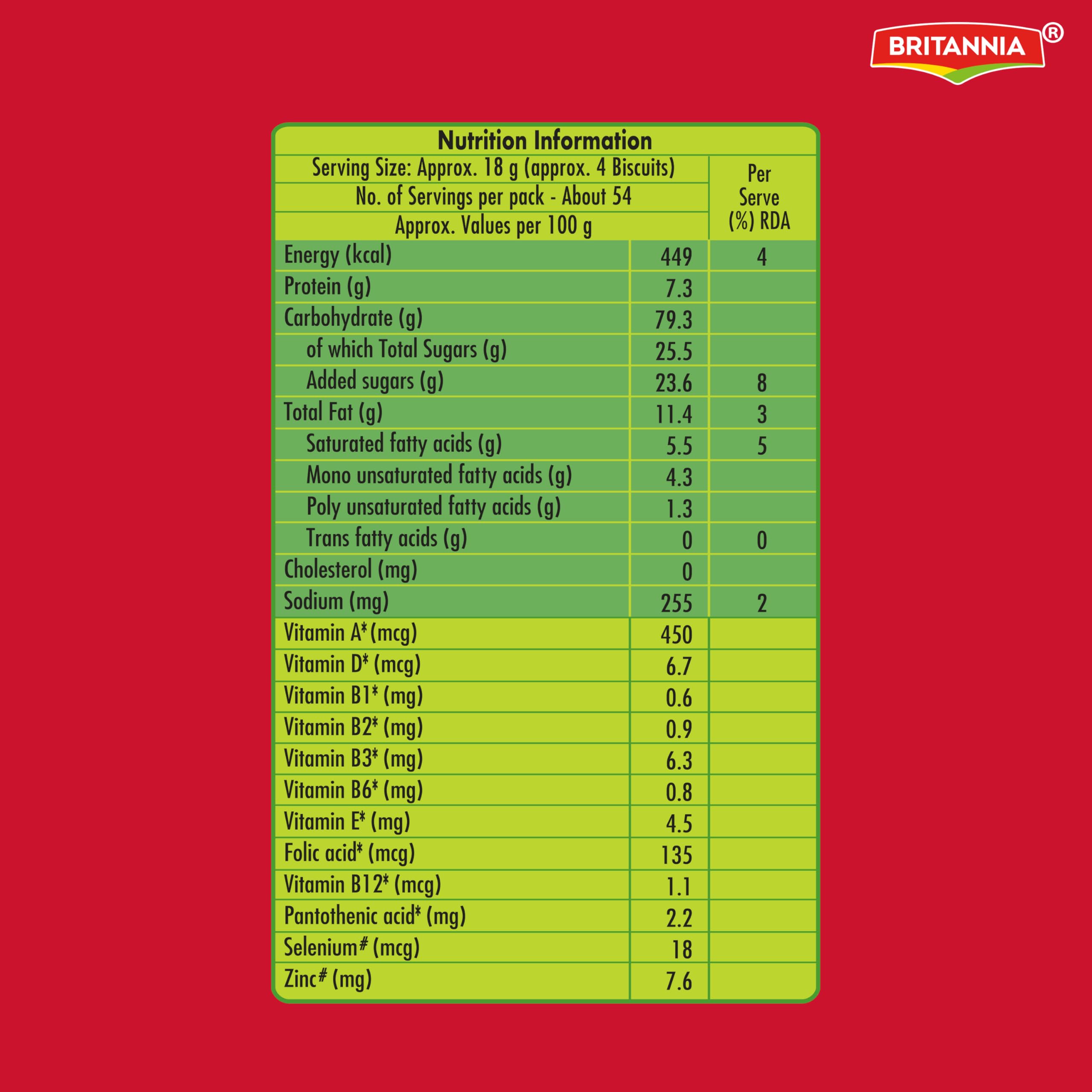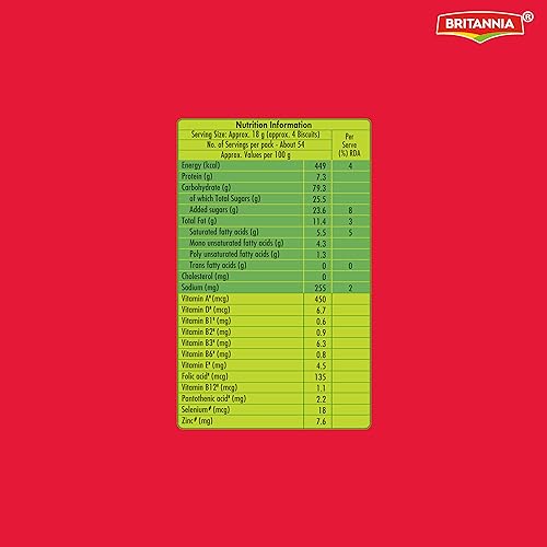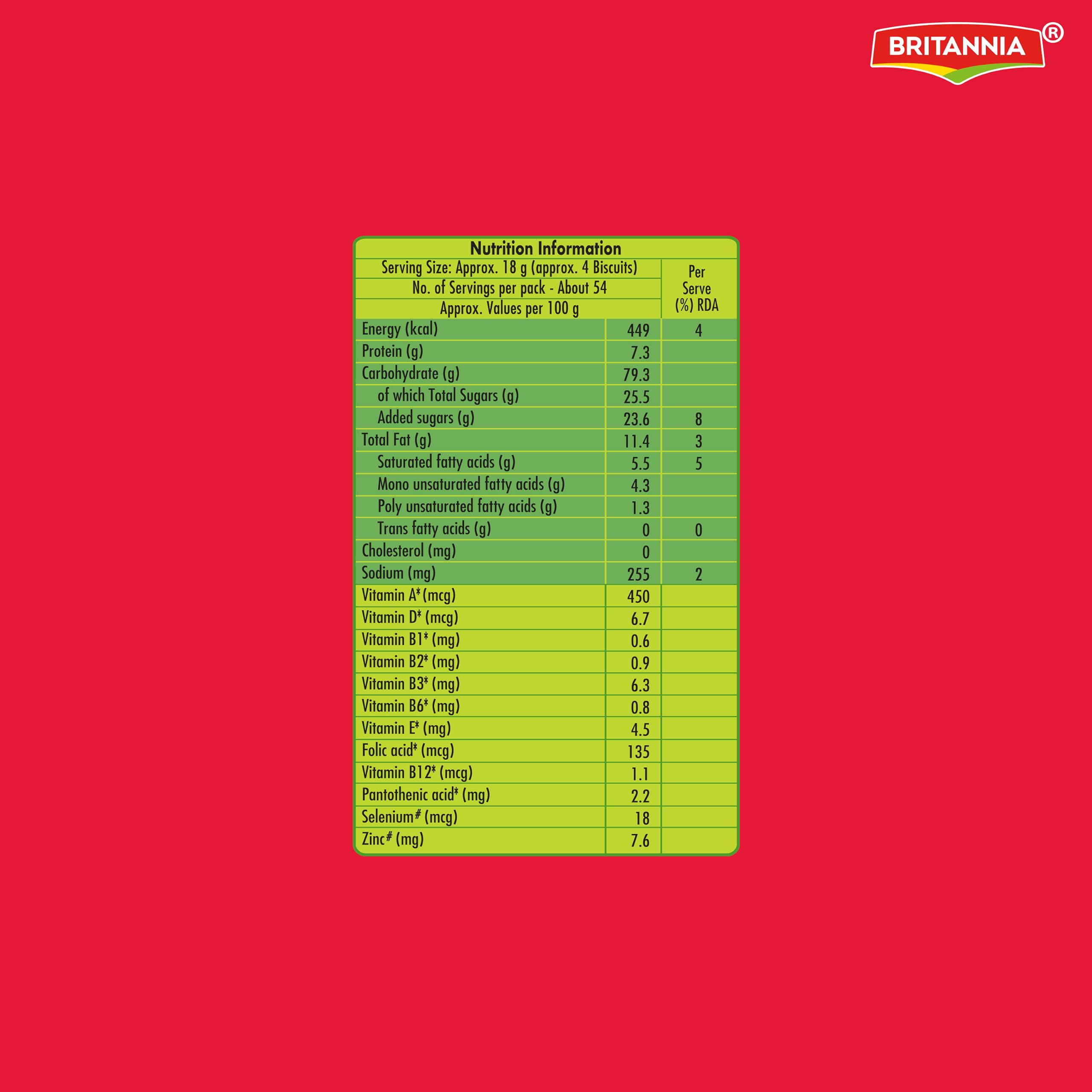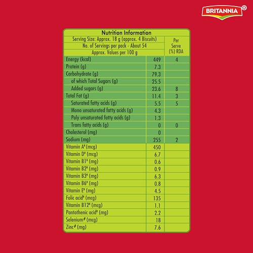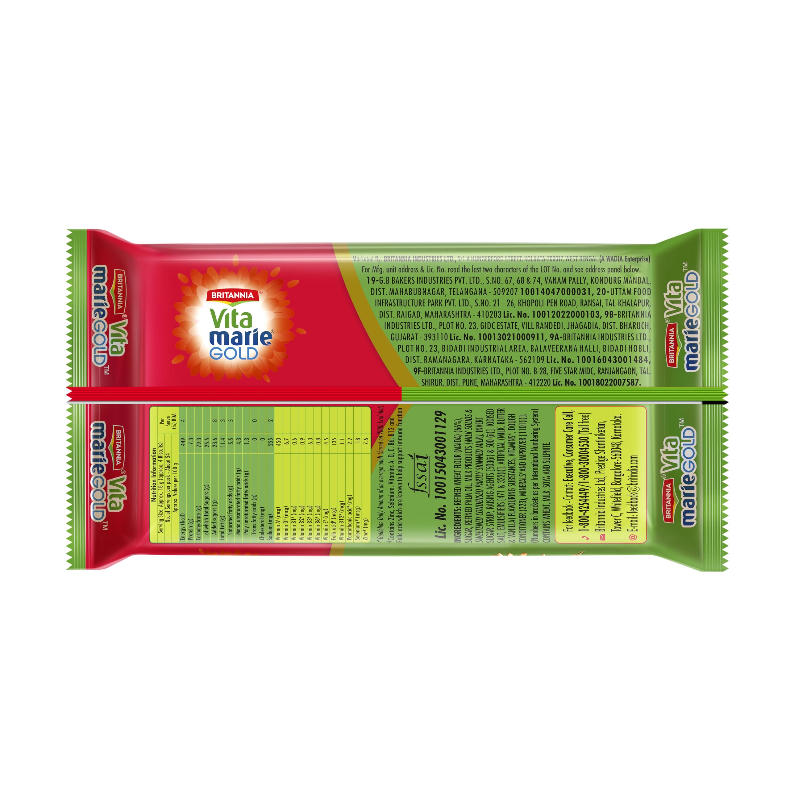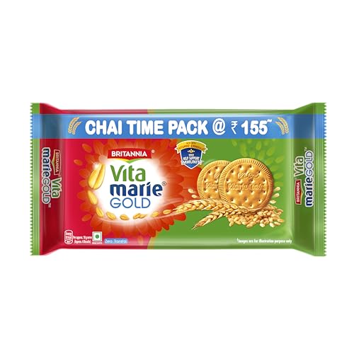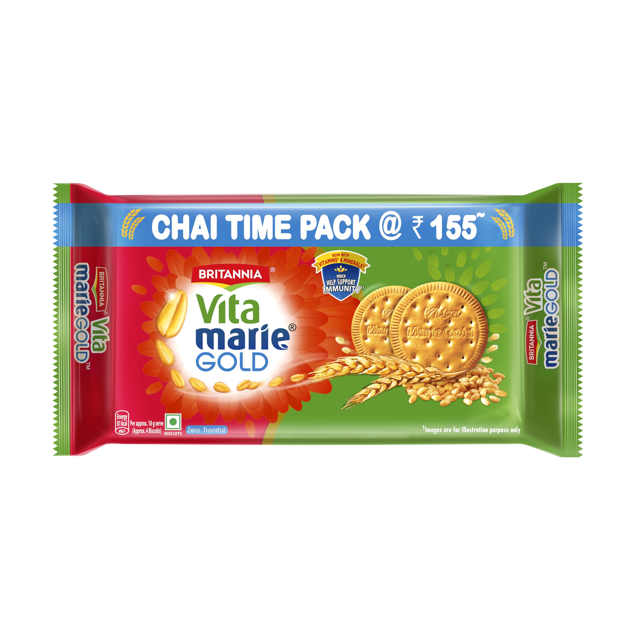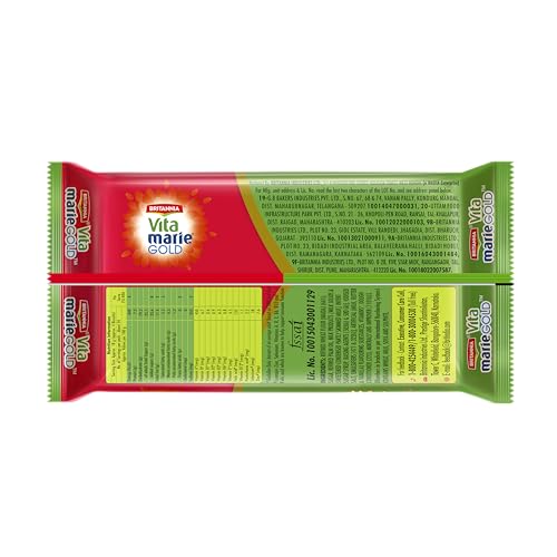 Britannia Vita Marie Gold biscuits are crisp and light biscuits packed with the goodness of 10 essential vitamins. Being low fat and zero cholesterol snacks marie gold biscuits act as a perfect companion for your cup of tea. Britannia biscuits and cookies for long has been a part of every home sharing those moments of joy believing in delivering fresh and healthy products Britannia India manufactures some of India's favourite brands like 50-50 tiger nutrichoice bourbon good day milk bikis and little hearts.
