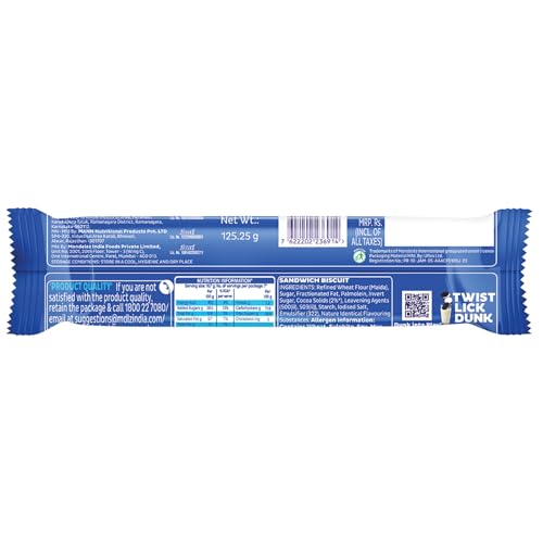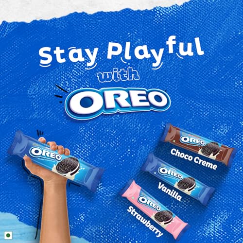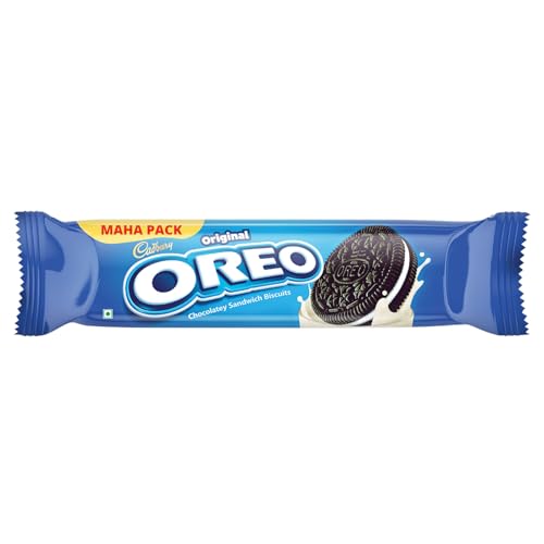 OREO: milk's best friend for over 100 years! Cadbury OREO Vanilla crème sandwich biscuit consists of two chocolatey biscuits with a rich vanilla crème filling between them. Cadbury OREO crème biscuits are made with cocoa which defines their unique chocolatey flavour. Add this crunchy delight to your snacks and gift yourself rich and smooth joy. OREO biscuits are perfect for snacking or enjoying as a treat at any time of the day. Twist lick and dunk! Enjoy OREO sandwich cookies with a glass of milk or add them to your favourite recipes such as cakes and milkshakes! Add a scoop of vanilla ice cream to OREO biscuits to make your own creamy dessert! Available in single & family/ combo packs. This biscuit pack is suitable for vegetarians