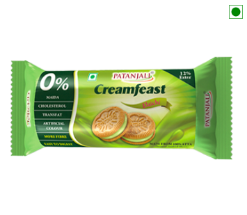Patanjali Creamfeast Elaichi biscuit is a cream-filled sandwich cookie that has zero percent maida, cholesterol, and transfat. It has an amazing taste and provides more fiber and nutrition.*Rich in protein.*Rich in dietary fibre.*Source of iron.whole wheat flour, sugar, edible vegetable oil(palm), milk solids, starch, dextrose, invert syrup, raising agent, edible common salt, malt extract, soya lecithin, dough conditioners, acidity regulators