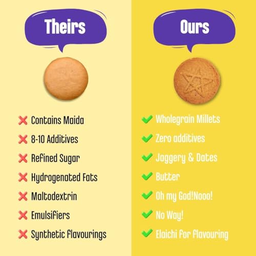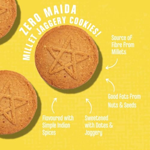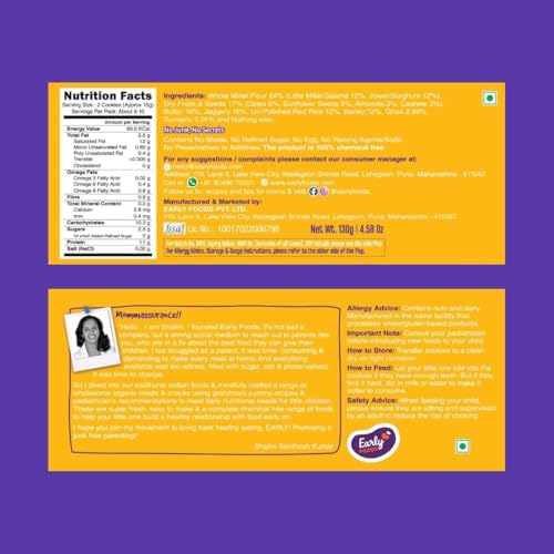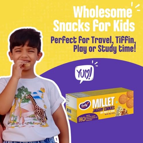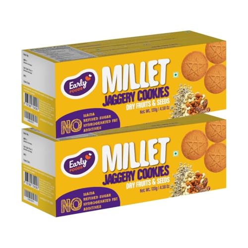 Early Foods jaggery cookies are made from organically certified millets organic jaggery butter superior quality dry fruits seeds. We worked really hard to create a healthy cookie recipe for your Childrenn and you without junk ingredients like maida refined Sugarr soda Preservativese artificial flavourings etc. Our cookies make your snack times easier and can be a part of your kidsss lunch boxes play times picnics after a sport etc. It can be enjoyed by little ones and grown ups too. Each pack contains 17-18 cookies.