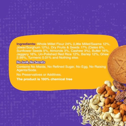 Ingredients in all 2 cookies: Organic Whole Grains (Foxtail Millet Little Millet White Rice Jowar/Sorghum Channa Dal) Butter Organic Jaggery Saboodana/Tapioca Flour Dry Fruit Powder (Almonds Pista Cashews Dates Walnuts Watermelon Seeds Lotus Seeds/Makhana