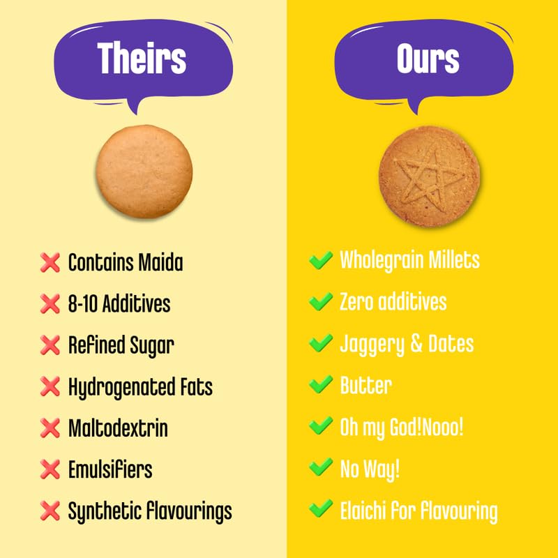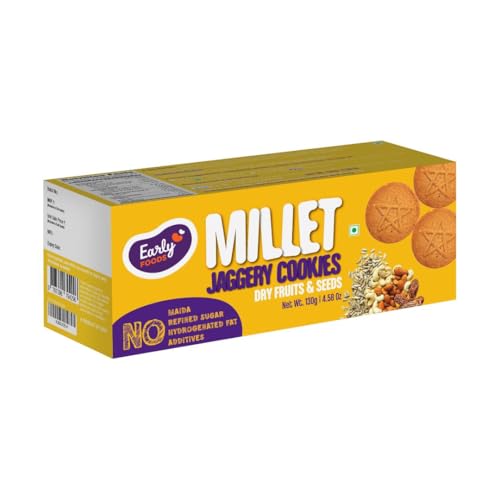 Early Foods jaggery cookies are made from organically certified millets organic jaggery butter superior quality dry fruits seeds. We worked really hard to create a healthy cookie recipe for your Childrenn and you without junk ingredients like maida refined Sugarr soda Preservativese artificial flavourings etc. Our cookies make your snack times easier and can be a part of your kidsss lunch boxes play times picnics after a sport etc. It can be enjoyed by little ones and grown ups too. Each pack contains 17-18 cookies.