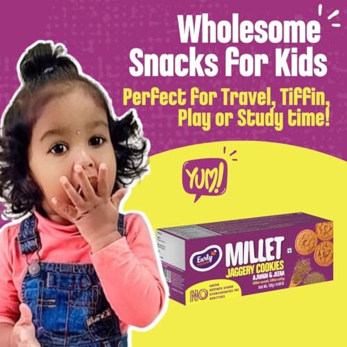 These Millet Cookies recommended for kids who are ready for all grains & nuts. Best if they have 1-2 teeth to chew. If not you can always dip in milk to help them bite. These cookies are made fromMillets pulses Jaggery Superior quality dry fruits & seeds that add natural vitamin and mineral supplements to your child's diet. Ajwain & Jeera Jaggery Cookies Pack. Contains ~18-20 pieces each. How are Early Foods Cookies Different & Special? - Freshly prepared batch of jaggery cookies for little ones & grownup's once you order online. Because children need freshly made foods for maximum nutrient absorption - Made from Whole Grains and 0% Maida - No Baking Powder No Soda No Raising Agents No Egg - 0% Sugar Sweetness from Jaggery and Dates - No hydrogenated fats. Made from pure cow butter. - No Preservatives or Artificial Flavours Ingredients: Whole Wheat Millet Flour Powdered Dry Fruits (Almonds Dates Sunflower Seeds Cashews) Butter Barley Handpounded Red Rice Jeera Ajwain Rock Salt and Nothing Else Shelf Life: Best before 4 months from MFD. Consume before 2 months from opening the pack. Best to store in a dry steel or glass air tight container. Why Moms love Early Foods: - Made from ancient Indian Super Foods - We make really small batches of food each day. So you can always feed super fresh meals. - Grandma inspired recipes simple healthy with minimal processing - No Sugar or salt. - No Preservatives colours or artificial flavours. All Natural