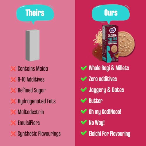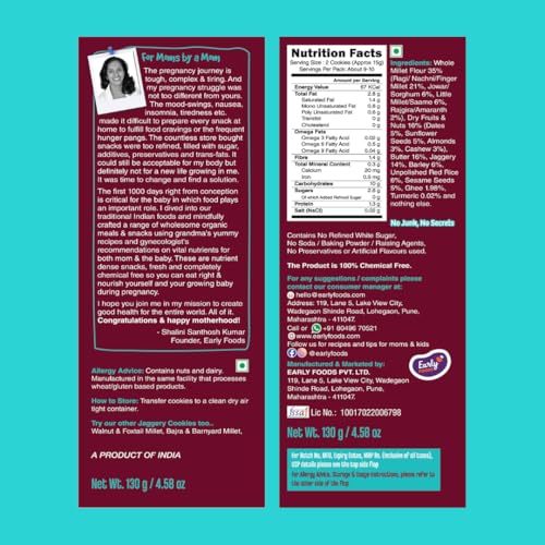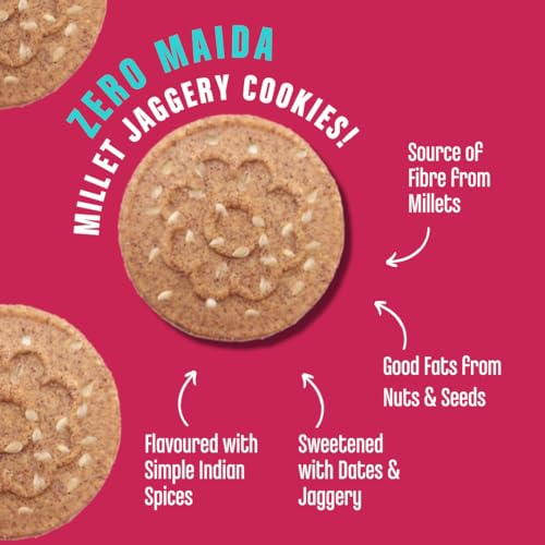 Ragi Sesame Cookies Ingredients : Powdered Dry Fruits 17% (Dates Sunflower Seeds Almonds Cashews) Butter 17% Ragi/Naachni 12% Amaranth/Rajgira 12% Jaggery 16% Little Millet/Saame Barley Hand-pounded Rice Jowar Sesame Seeds 4% Nutmeg and nothing else.