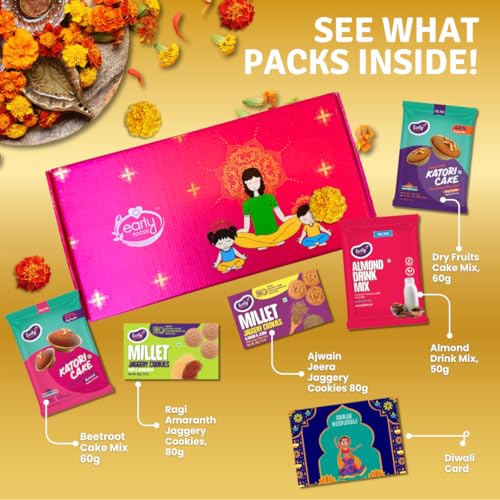 Early Foods - Utsav Diwali Gift Hamper - 5 Pack - Diwali Snack Gift Box Contains - Multigrain Millet Jaggery Cookies 80g, Ajwain Jeera Millet Jaggery Cookies 80g, Almond Drink Mix 50g, Beetroot Cake Premix 60g, Dry Fruit Cake Premix 60g & Deepavali Greeti