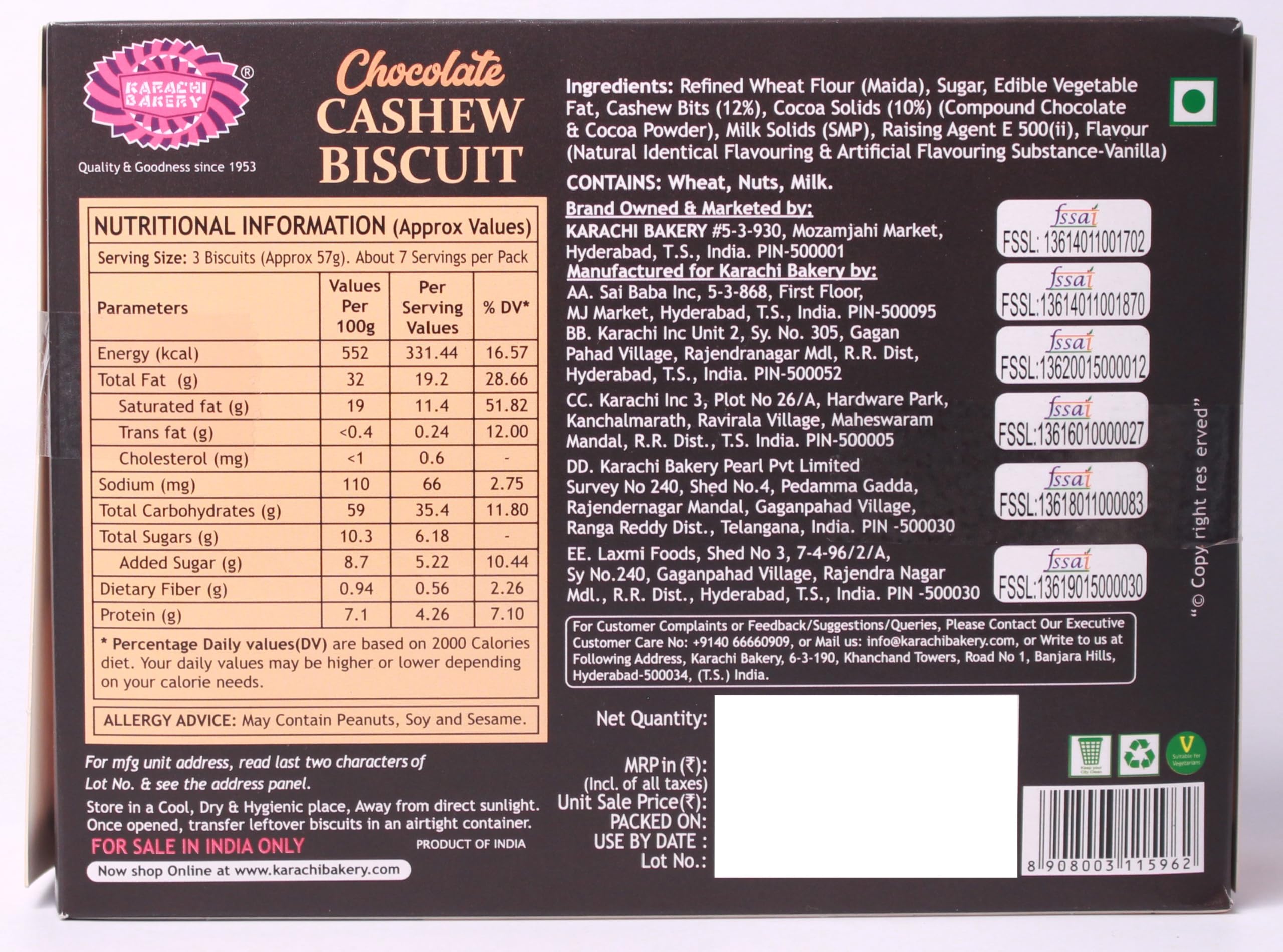Karachi Bakery Cashew and chocolate Cookies/Biscuits are a delightful combination of flavors and textures. These cookies are made with a blend of premium ingredients including cashews chocolates and other traditional cookie ingredients. The cookies/biscuits from Karachi Bakery have a buttery and crumbly texture that is complemented by the crunchiness of cashews and the subtle nuttiness chocolates. The cashews and Chocolates are finely chopped or ground and incorporated into the cookie dough creating a rich and nutty taste.