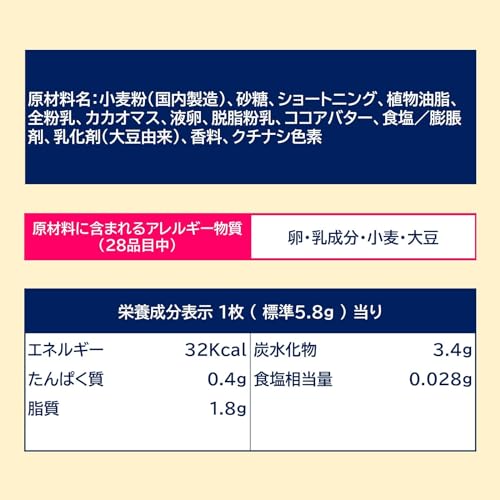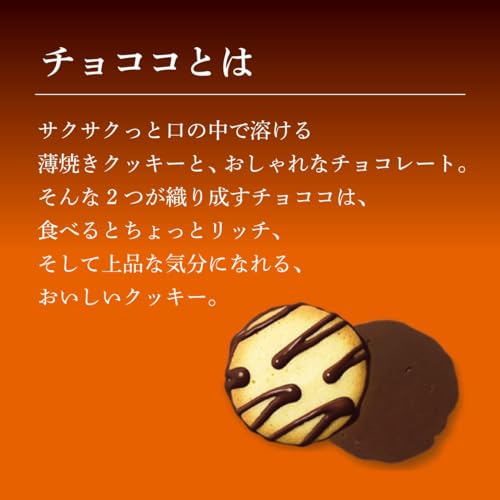 This chococo is a perfect harmony of Langue de Chat-type thinly baked cookies with a crispy and light texture and mellow chocolate. The elegant taste that melts in your mouth and the stylish chocolate decoration are perfect for a relaxing moment. Raw materials/components Flour (domestic production) sugar shortening vegetable oil whole milk powder cacao mass liquid egg skim milk powder cocoa butter salt/leavening agent emulsifier (soybean-derived) flavoring gardenia pigment