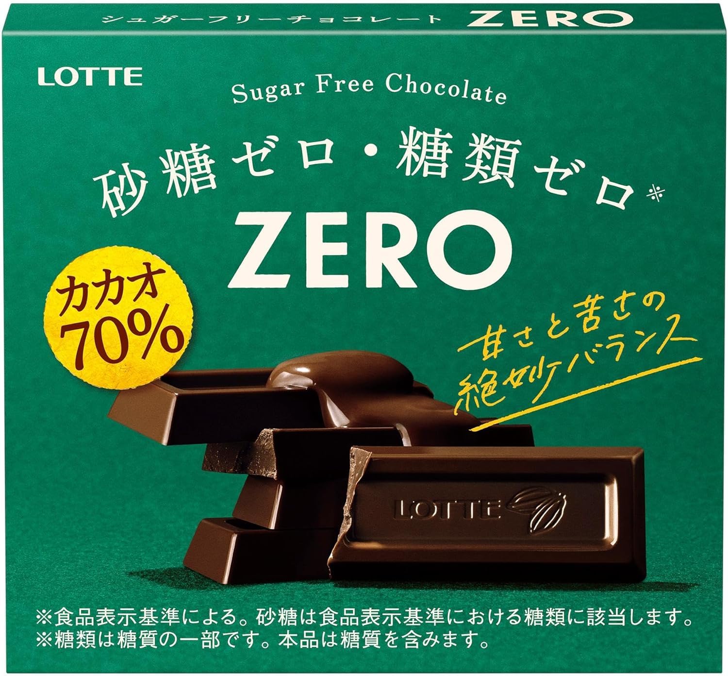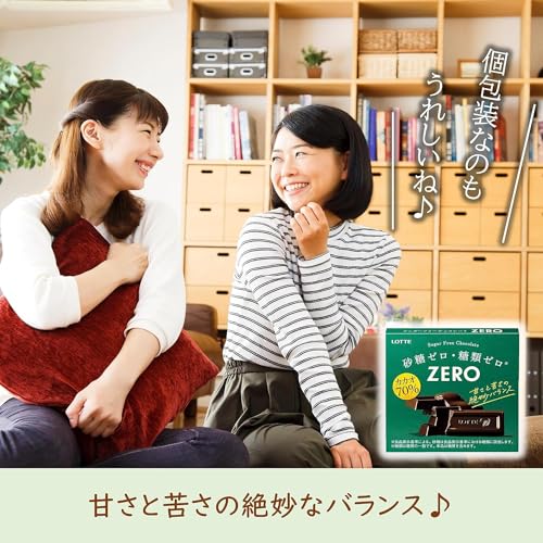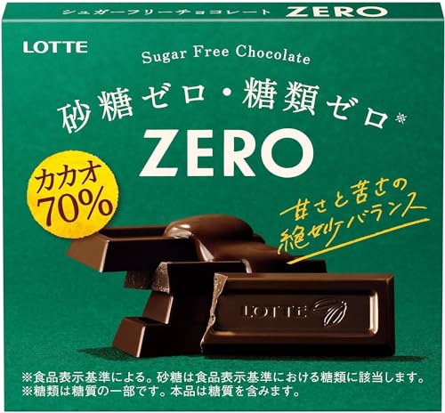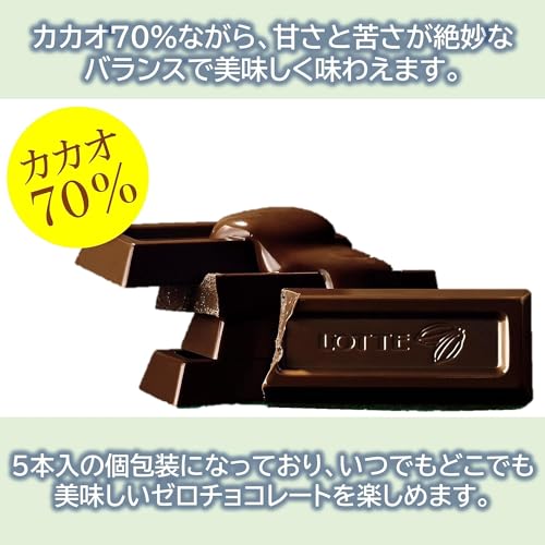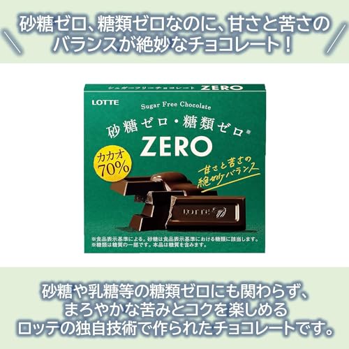 This chocolate is made using Lotte's unique technology allowing you to enjoy a mellow bitterness and richness despite having no sugars such as sugar or lactose. Despite being 70% cacao it has a delicious balance of sweetness and bitterness. Individually wrapped in 5 packs you can enjoy delicious Zero Chocolate anytime anywhere. Raw materials/components Cacao mass (cacao beans (Ghana Venezuela)) maltitol cocoa butter cocoa powder vegetable oil foods made from milk (dietary fiber butter isolated milk protein) lactitol milk paste cacao extract Salt/emulsifier (soybean derived) flavoring sweetener (aspartame/L-phenylalanine compound sucralose) vitamin P