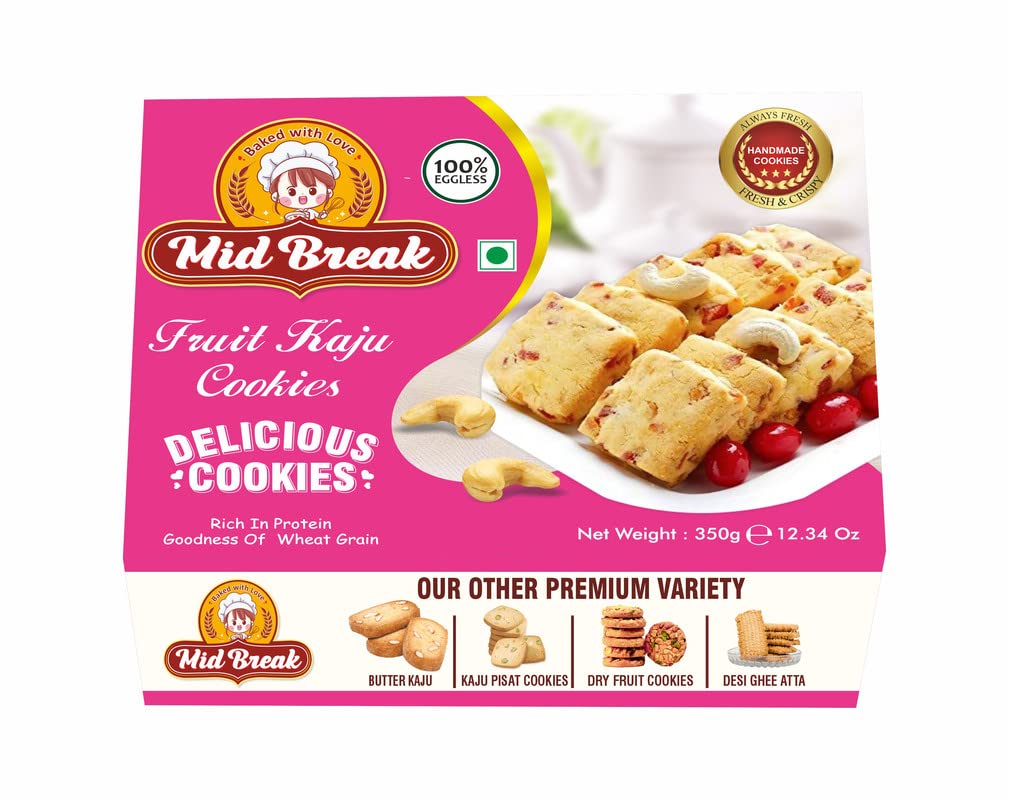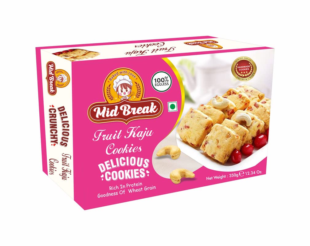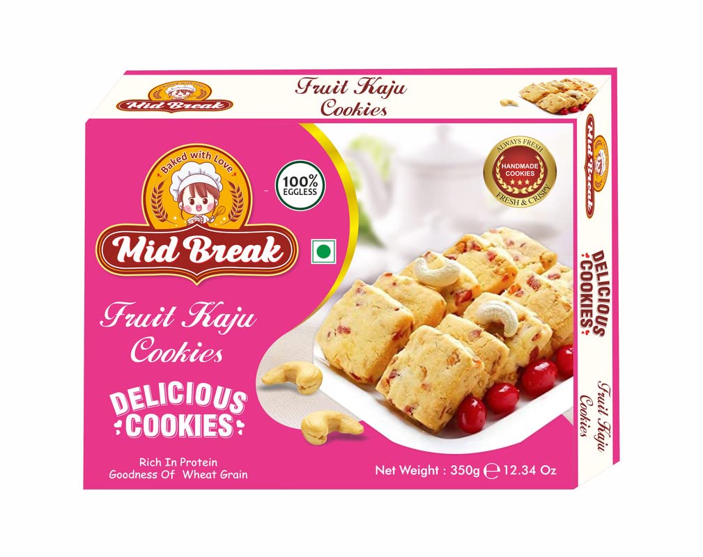 Fruit Kaju cookies marketed by MidBreak are baked with 100% real Kaju and fruits. These biscuits are sweet and crisp. The cookies are made with high-quality ingredients. These biscuits are a healthy alternative to other unhealthy snacks. They are a great snack for breakfast or afternoon tea. You can buy and send them to your loved ones as a gift. You can also keep some packets in your pantry for quick snacking. Midbreak cookies are made with utmost love and care. We always try to serve you with the best we can. Midbreak cookies are 100% eggless and vegetarian cookies.