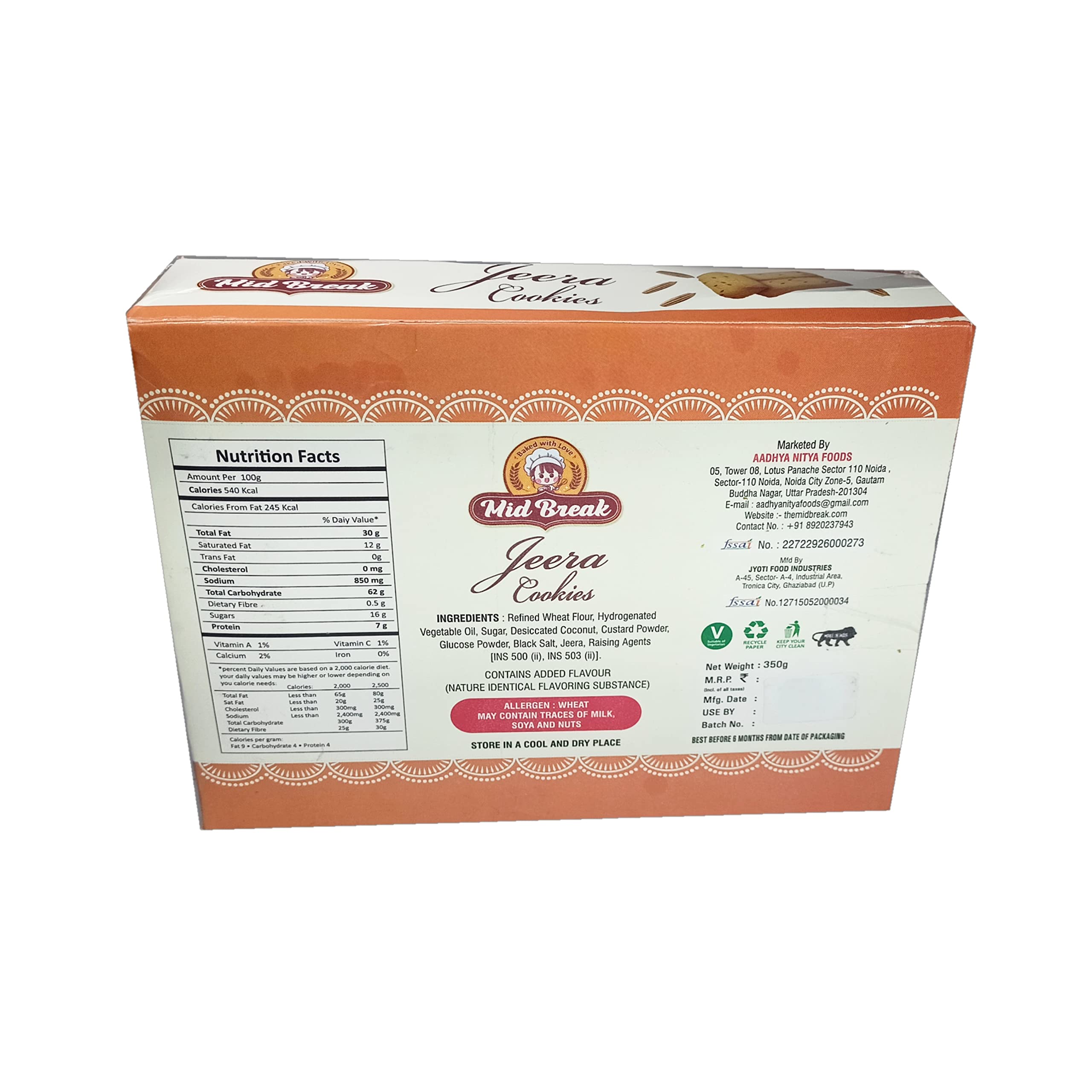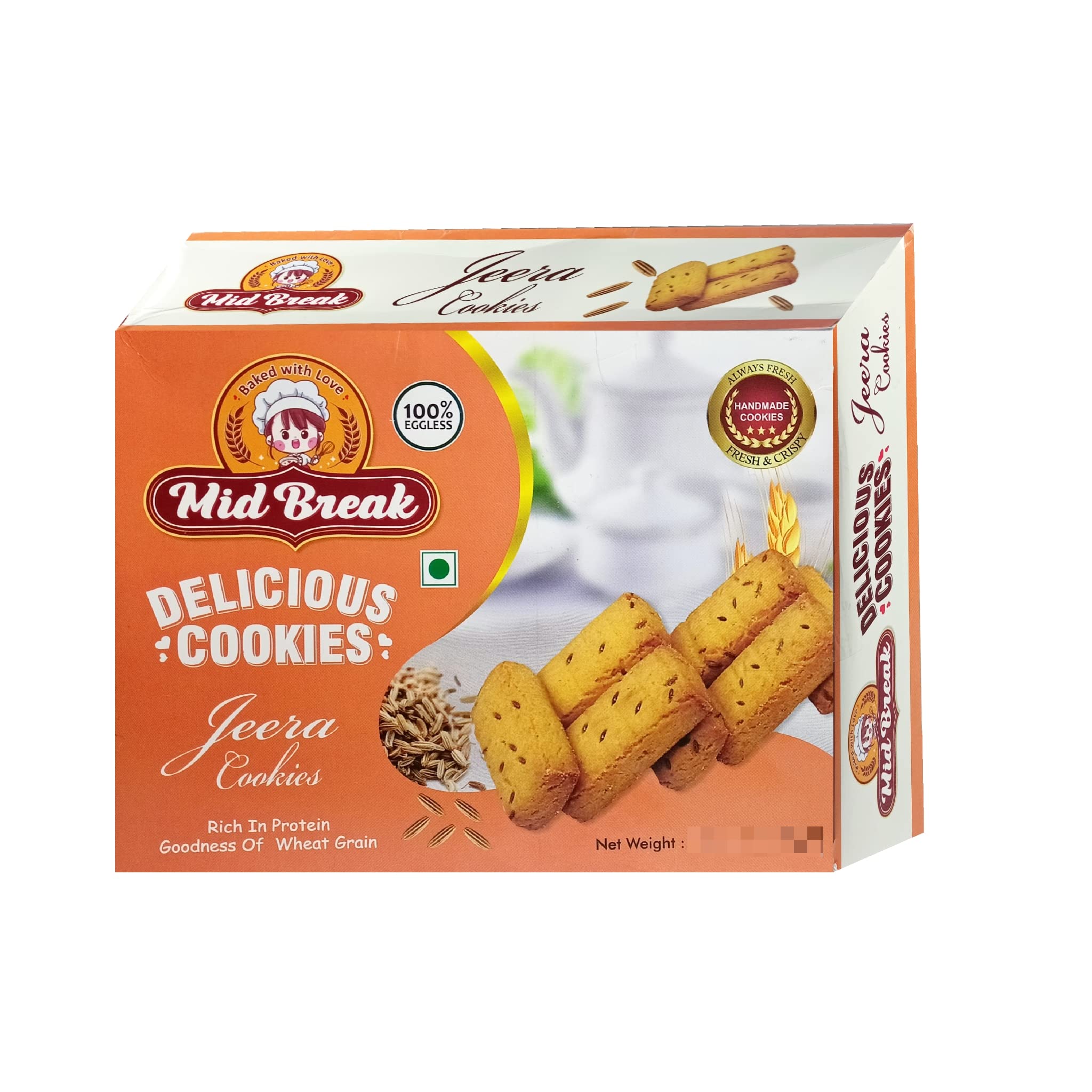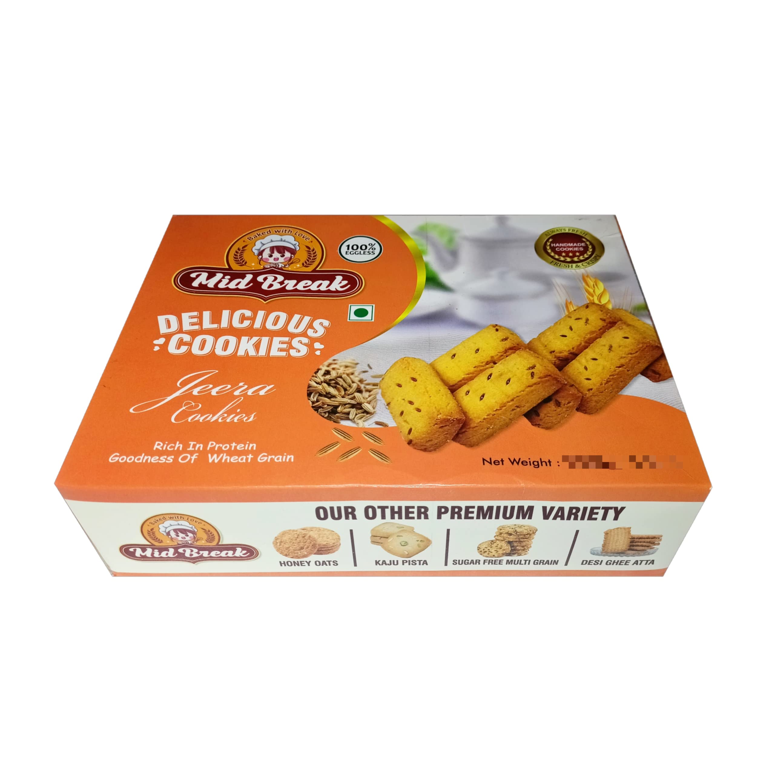 We Indians love to drink tea. And, India is one of the largest producers of tea in the entire world. But Indians don't just drink tea by itself. We always need snacks to accompany it. The first snack which always comes in our mind is Jeera Cookies / Biscuits. Some people go on to the extent to call Jeera Biscuits National Biscuits of India. We, at MidBreak, market Jeera Cookies which has 25% lesser fat that majority of branded biscuits. Midbreak cookies are wholesome blend of healthy and natural ingredients. With every bite our cookies melt in your mouth, giving you a rich flavour of all those natural ingredients. Midbreak cookies are made with utmost love and care. We always try to serve you with the best we can. Midbreak cookies are 100% eggless and vegetarian cookies. Midbreak cookies are handmade and of premium quality. They are 100% eggless cookies and are rich in dietary fiber. Cookies from MidBreak are always baked fresh. Midbreak cookies are handmade and of premium quality. Cookies are an all-time favorite snacks of those who loves tasty and healthy snacks. Midbreak cookies can be gifted on various special occasions like Diwali, Rakshabandhan, Janamashtmi, New year, Housewarming, day, Christmas, Mother's day, Father's day, etc.