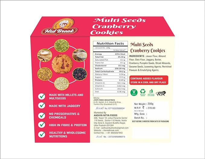 Indulge in the wholesome goodness of Midbreak Multi Seeds Cranberry Oats Cookies, a delicious and nutritious snack that supports your healthy lifestyle. These gluten-free cookies are thoughtfully made with a blend of sorghum flour, almond flour, and oats flour, providing a rich, nutty flavour and a tender texture. Sweetened with natural alternatives and containing no refined sugar, these cookies are a guilt-free treat. They are packed with the tangy sweetness of cranberries and the crunch of multi seeds, delivering a delightful taste experience with every bite. The seeds add an extra boost of healthy fats, fiber, and essential minerals, making these cookies a powerhouse of nutrition. Perfect for those with gluten sensitivities or anyone looking to enjoy a healthier snack, these cookies are ideal for kids' lunchboxes, afternoon tea, or a post-workout treat. Conveniently packaged, they are also perfect for busy mornings, travel, or any time you need a quick and healthy snack on the go. Choose Midbreak Multi Seeds Cranberry Oats Cookies for a snack that's as nutritious as it is delicious. Enjoy the balance of wholesome ingredients and satisfying flavours that support your health and well-being.