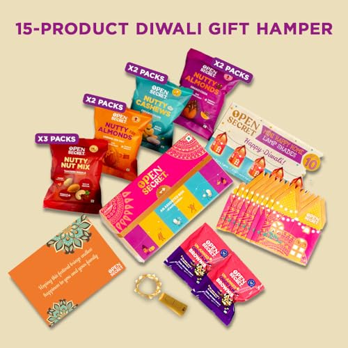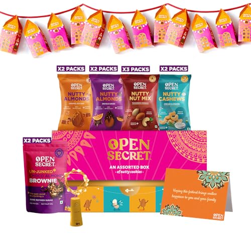 HomeGrocerySnacksCookiesOpen Secret Holi Gift Box | Combo of 15 | Dry Fruits Gift Box, Cookies, Brownie, Gift Hamper, Holi Gift Hampers, Gift Set, Corporate Gifts for Employees, Festive Lights, Card & Lantern