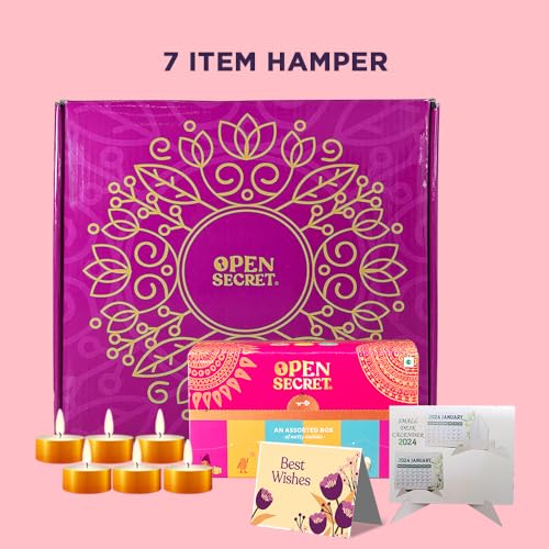 Open Secret Gift Hamper | 7 Item Gift Combo - Gift Box, Card, Scented Candles (Pack of 6), Assorted 12 Cookies, Calendar | Healthy Unjuncked Food | Gift for Corporate, Family, Friends