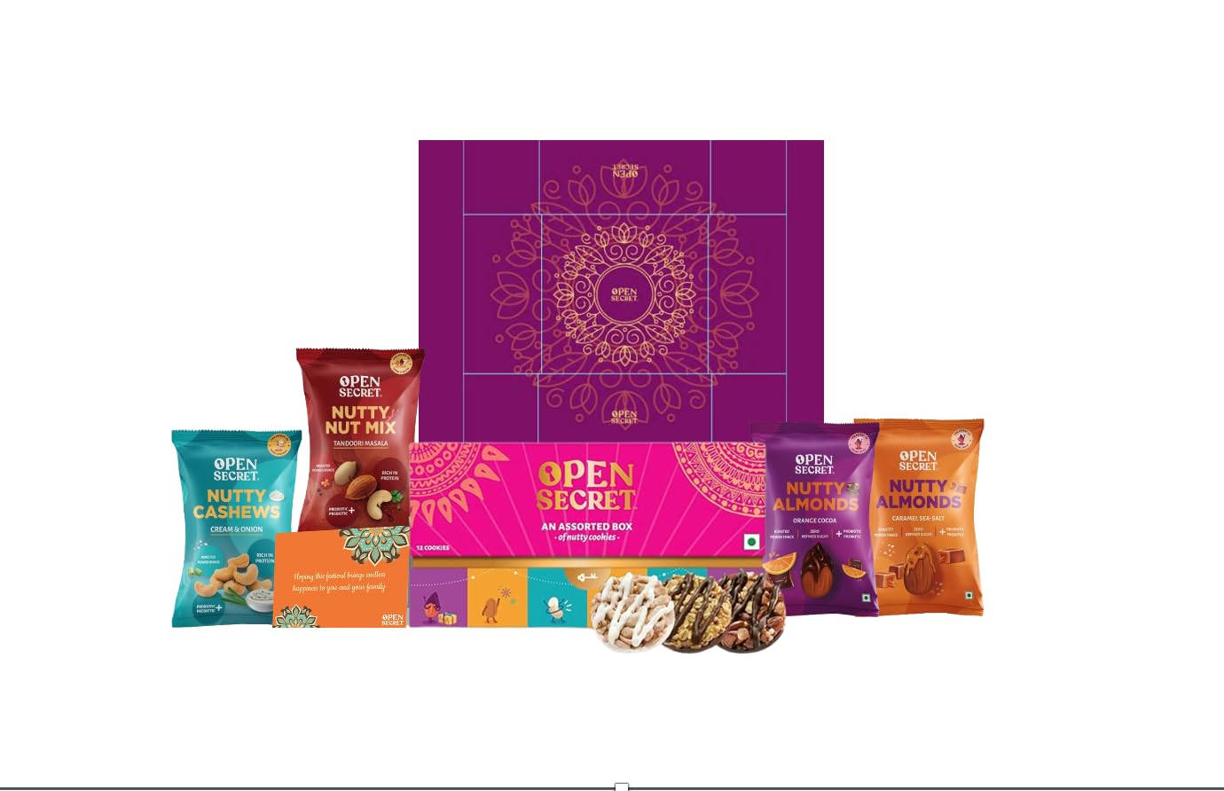Open Secret Premium Gift Hamper | Assorted Cookies Gift Box (12 Cookies), Assorted Nuts (Tandoori, Caramel Seasalt, Orange Cocoa, Cream and Onion), Festive Card, Gift Box