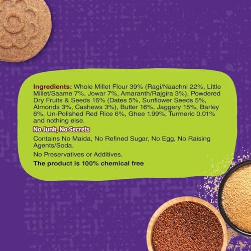 The absolute children friendly healthy cookies. These cookies are made from organically certified whole grains dry fruits & seeds that add natural vitamin and mineral supplements to your child's diet. All dry fruits are powdered so your child wont face a difficulty in chewing hard nuts. We use 100% cow butter and no hydrogenated or trans fats. They are eggless and contain no soda or baking powder. Contains no artificial flavours colours chemicals or preservatives. br>