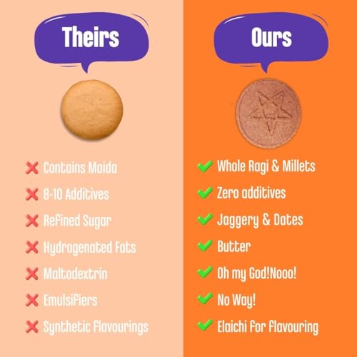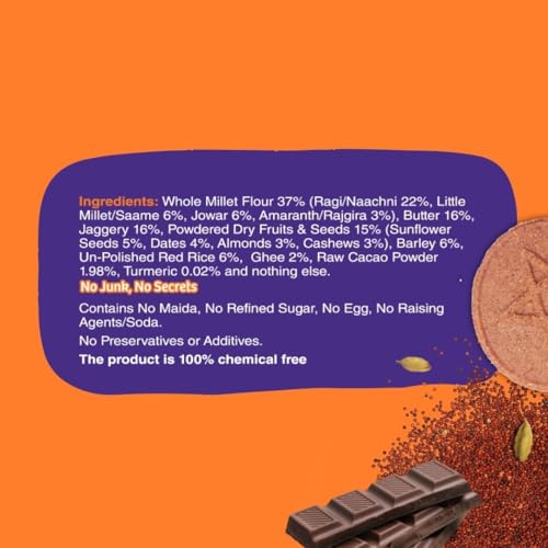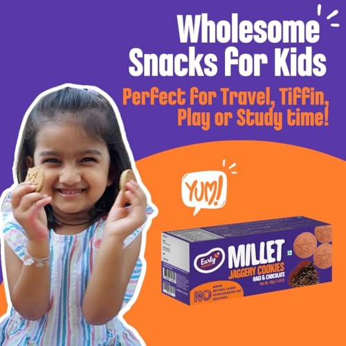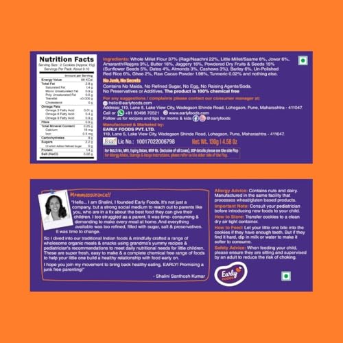 Early Foods jaggery cookies are made from organically certified millets organic jaggery butter superior quality dry fruits seeds. We worked really hard to create a healthy cookie recipe for your Childrenn and you without junk ingredients like maida refined Sugarr soda Preservativese artificial flavourings etc. Our cookies make your snack times easier and can be a part of your kidsss lunch boxes play times picnics after a sport etc. It can be enjoyed by little ones and grown ups too. Each pack contains 17-18 cookies.