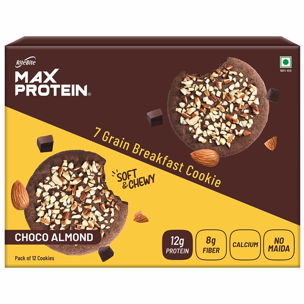 HomeGrocerySnacksCookiesRiteBite Max Protein Choco Almond Cookies with 12g Protein 8g Fiber | No Madia GMO Free No Preservatives 7 Grain Breakfast Cookies 60g (Pack of 12)