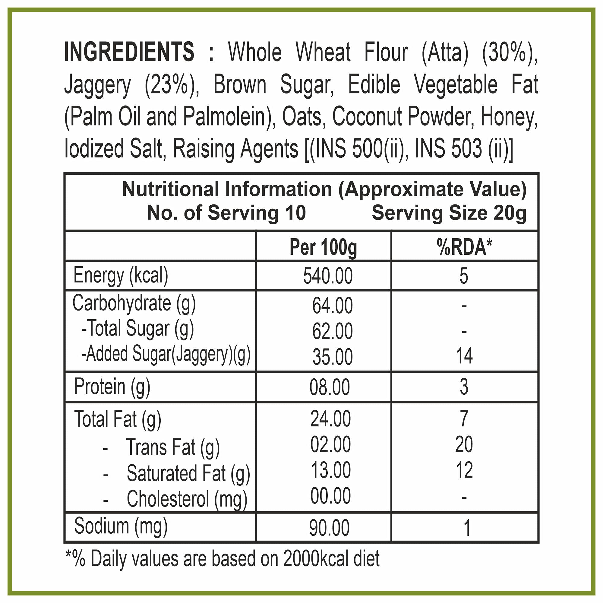 Sodium Aluminum Sulphate (INS 521) Starch Mono Calcium Phosphate (INS 341) Jaggery(23%) Whole Wheat Flour(Atta)(30%) Vegetable Fat (Palm Oil Palmolein) Refined Wheat Flour (Maida) Custard Powder Milk Solids Cardamom Baking Soda Baking Powder (Sodium Bicar