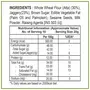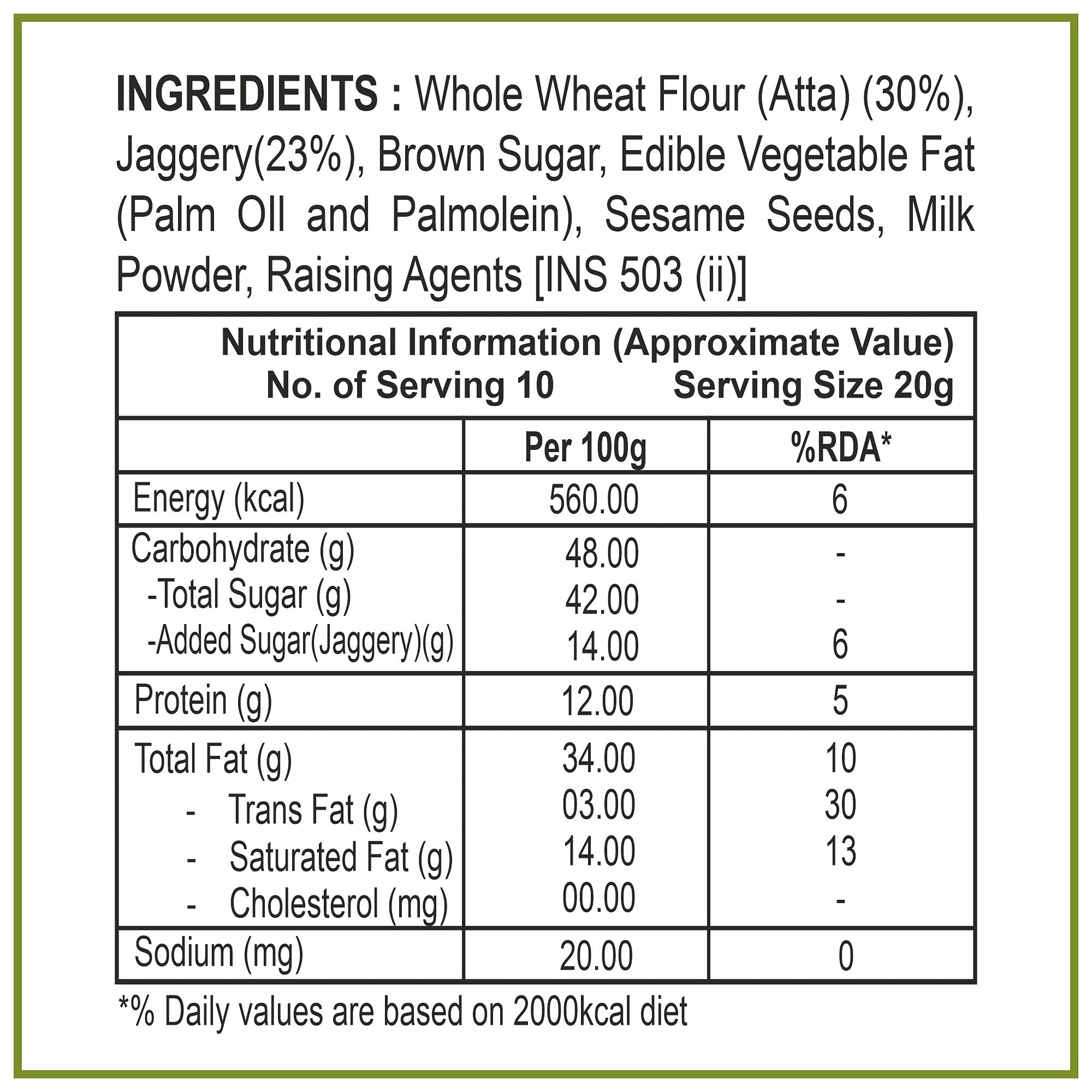 Sodium Aluminum Sulphate (INS 521) Starch Mono Calcium Phosphate (INS 341) Jaggery(23%) Whole Wheat Flour(Atta)(30%) Vegetable Fat (Palm Oil Palmolein) Refined Wheat Flour (Maida) Custard Powder Milk Solids Cardamom Baking Soda Baking Powder (Sodium Bicar