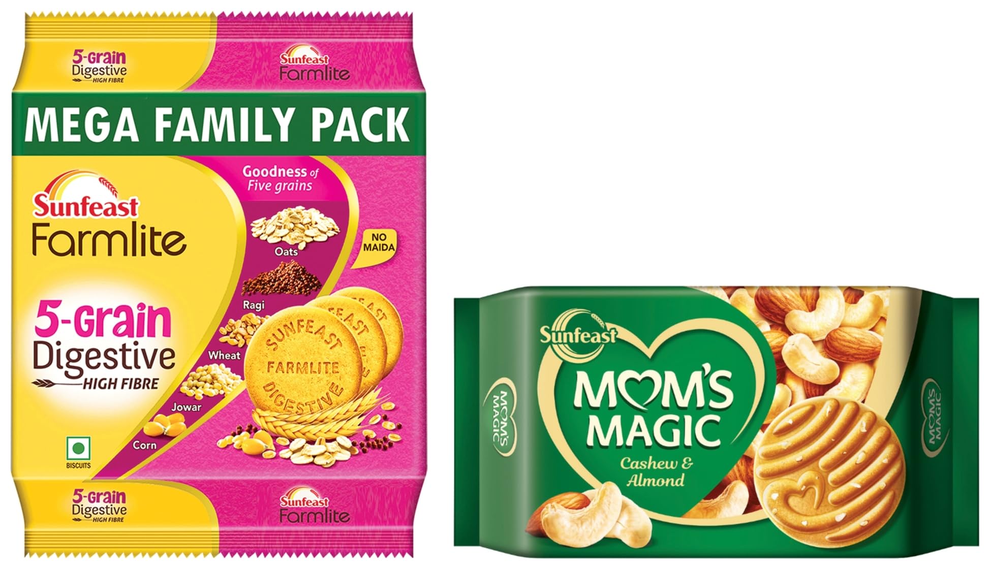 Sunfeast Farmlite 5 Grain Digestive Biscuit High Fibre Biscuit Goodness of 5 Grains 800 g PackHereâs a tasty way to power through the day. The Sunfeast Farmlite 5 Grain Digestive Biscuit is a High Fibre biscuit thatâll give you the power to seize the day. It is made with the goodness of five grains like Ragi Oats Jowar Corn and Wheat. These five super grains will keep you energised to live a multitasking life. Rich in fibre Sunfeast Farmlite 5 Grain Digestive Biscuit is not just any digestive it's DiZESTive and takes care of all your dietary requirements to keep you active to complete all your dayâs tasks. Made with the best quality ingredients that are sourced from the choicest farms in India. They contain no maida and are made using Aashirvaad atta and the goodness of those 5 grains. Baked to that perfect golden-brown crunch these biscuits are not only good for you but also taste amazing. Pair it with your tea and you are in for a treat. So add this delicious biscuit to your tea-time routine and take a bite of some crunchy goodness every day.Mom's Magic Rich Cashew Almond Cookies | Roasted Cashew Almond | Rich Butter Biscuits | Mom's Favourite Baked Cookies 584gMom's Magic Cashew Almond Cookies - Just the way Mom would make it. Nutty cookies Mom's Magic are loaded with choicest cashews and almonds which are roasted to perfection for a rich full-bodied taste. Complemented with roasted Butter that has mildly sweet caramel notes which give a unique flavour and rich smoothness to Mom's Magic Biscuits. A perfect tea time snack these cookies are your 4pm companion for when you want a bite of sweet nuttiness that envelops your senses just like a mom's hug. Enjoy these baked biscuits and step into a world abundant with warmth heartfelt hugs and mom's magical taste