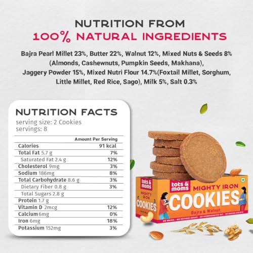 This Combo contains 150 gms of each pack of Millet & Jaggery Cookies- Calcium Magic and Folic Fiesta. Healthy tasty and nutrient-rich cookies made by using 100% natural ingredients. Good fats carbohydrates and proteins come together in dry fruits seeds and wholesome millet grains. Butter and jaggery bind them together and provide natural sweetness Contains No refined sugar No Maida No Baking powder No Baking soda No Maltodextrin and No eggs. No refined sugars No Maida No Baking powder No Baking soda No Maltodextrin and No eggs. Contains 12-15 cookies per pack.