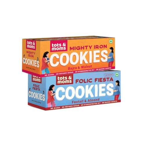 This Combo contains 150 gms of each pack of Millet & Jaggery Cookies - Mighty Iron and Folic Fiesta. Healthy tasty and nutrient-rich cookies made by using 100% natural ingredients. Good fats carbohydrates and proteins come together in dry fruits seeds and wholesome millet grain Butter & Jaggery bind them together and provide natural sweetness Contains No refined sugar No Maida No Baking powder No Baking soda No Maltodextrin and No eggs. No refined sugars No Maida No Baking powder No Baking soda No Maltodextrin and No eggs. Contains 12-15 cookies per pack.