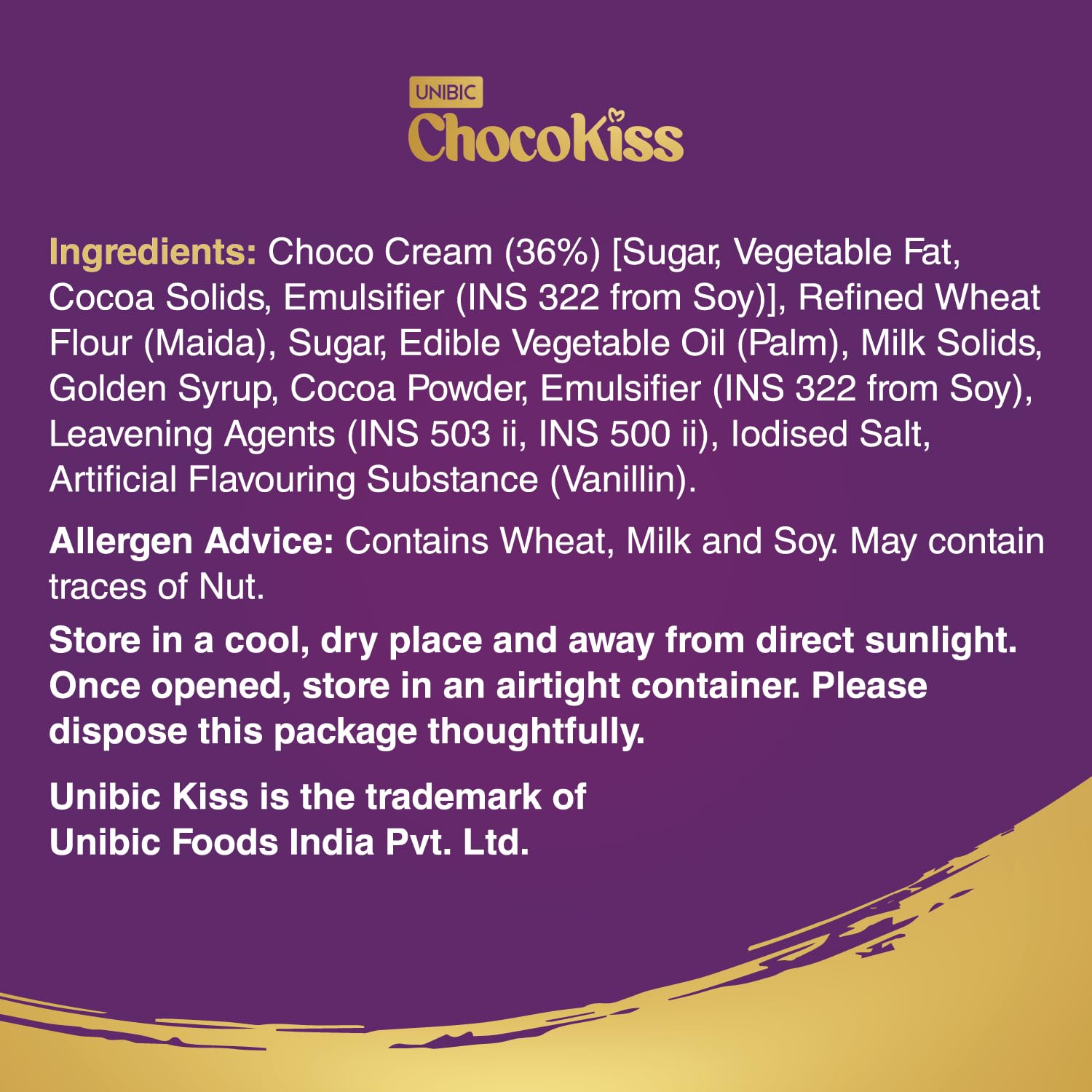 Deemed as India's first chocolate-filled cookies the scrumptious taste of UNIBIC Choco Kiss Cookies can certainly satisfy your taste buds. UNIBIC biscuits with choco fills can be your staple teatime snack as the rich creamy chocolate will enhance the beverage's taste. UNIBIC ensures that every bite of the chocolate cookies oozes with thick and flavourful cream using the latest heat stabilisation technology. Indulge yourself in the soft and luscious crust baked to perfection and satiate your taste buds with the heavenly and premium taste of cocoa cream filling inside. The sinful indulgence of the choco fills is an experience you can never forget and you will end up wanting more every time. Let the delectable taste of UNIBIC chocolate biscuits satisfy your midnight cravings and untimely munchies. Pick a choco fills in Fresh to share and enjoy the divine experience with your friends and loved ones. The carefully chosen vegetarian ingredients make the UNIBIC Choco Kiss Cookies an appropriate snack. Surprise your little ones by packing rich and creamy UNIBIC biscuits in their tiffin box. Get a pack now to savour the perfect chocolate-filled delicacy that can never disappoint you.