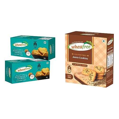 Wheafree Gluten Free Coconut Cookies - Pack of 2 (200g each) | Tasty & Crunchy | Coconut Flavoured Cookies | Best Tea Time Snacks | Egg Free | 100% VegetarianWheafree gluten-free Coconut Biscuits flavoured with a rich aroma and taste of coconut leaves behind a crunchy and crispy sensation after a few chews. These coconut biscuits have now become an ideal companion for tea time. It can be consumed as snacks with morning or evening Tea/Coffee or can be combined with other recipes. It is a very good option for Celiac Patients who can’t stop craving for tasty and healthy biscuits.Wheafree Gluten Free Jeera Cookies (400g) | Lactose Free | Crispy & Crunchy | Best Tea Time Snacks | 100% Vegetarian and Wholesome IngredientsWheafree Jeera/Cumin Cookies are a favourite tea time snack which is baked to crunchy perfection. Our gluten free cookies are a crispy in texture and have a delicately balanced flavour. They go perfectly well with your hot tea coffee and you can also snack them while travelling.