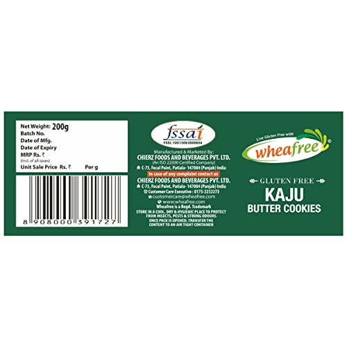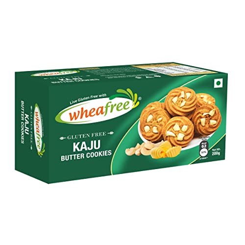 Wheafree Gluten Free Kaju Butter Cookies (Pack of 2 - 200g each)These cookies have now become an ideal companion for tea time. It can be consumed as snacks with morning or evening Tea/Coffee or can be combined with other recipes. We cater to a wide range of gluten-free products made in a contamination-free environment. Wheafree cookies and biscuits are manufactured to provide safe and healthy food options to people suffering from intolerance towards Gluten. Wheafree cookies and biscuits are free from grains like Wheat Barley Oats Rye and are made in 100% Gluten-free environment. We have made these multi-seed cookies and biscuits not only to take care of your nutritional needs but also to satisfy your craving for tasty and delicious snacks requirement.
