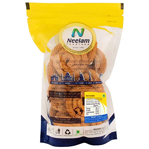 Neelam Foodland Less Oil Chakli made Rice and chana . While it is perfect to have on a cold rainy day with a cup of chaai this versatile snack is also light enough to enjoy on a hot summers day with a glass of juice or to take along to school or office in a snack box Tea-time is never complete without dry snacks. Carry a pouch of chakli to enjoy mini office breaks or on picnics. Enjoy a variety of snacks from Neelam Foodland in your next party. Store in a cool and dry place.