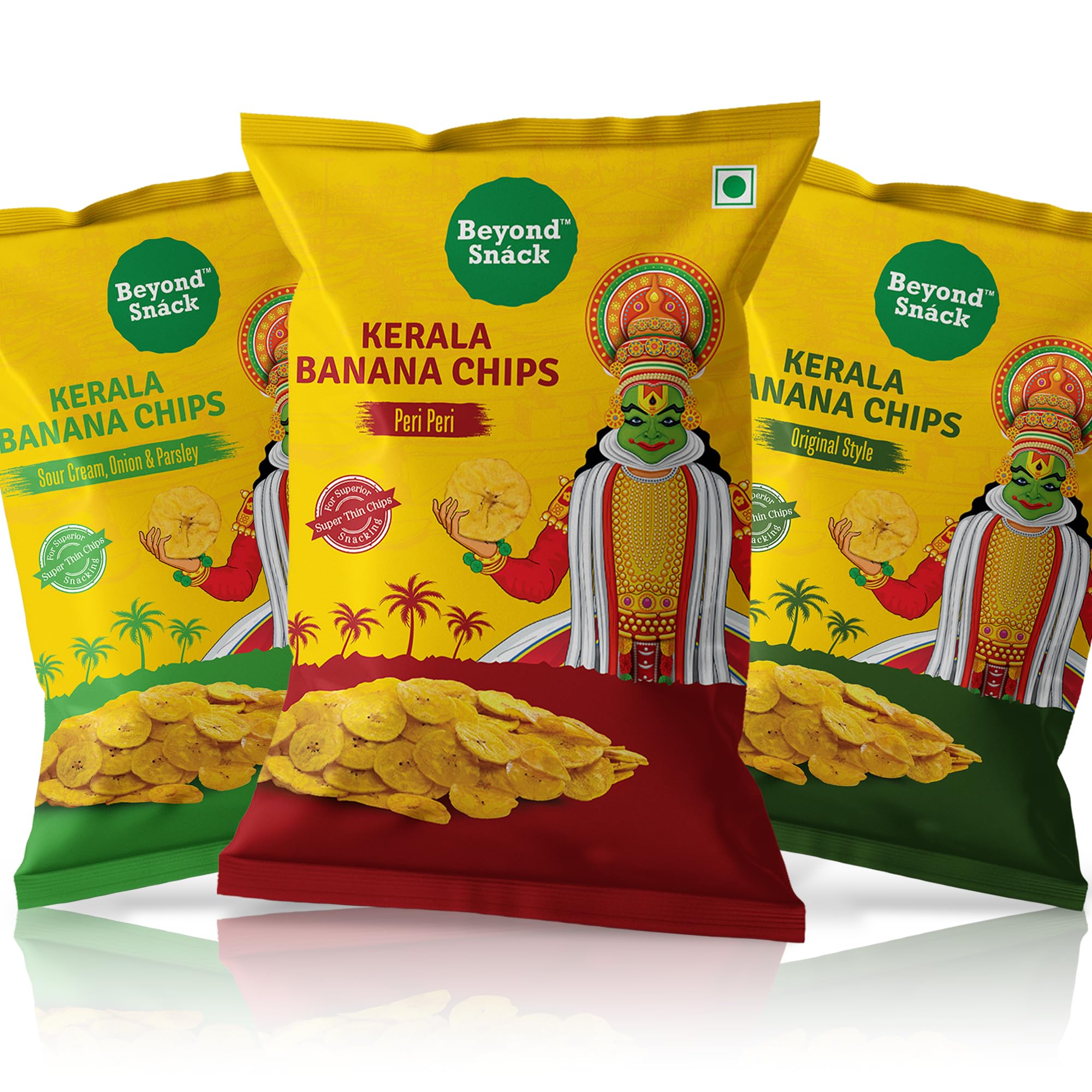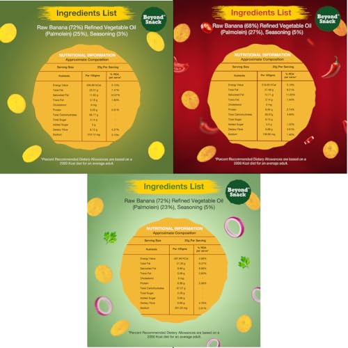 Beyond Snack banana chips is a new age Authentic Kerala Style Banana chips made from an exclusive variety called Nendran which grows in Kerala. We take special care to responsibly craft it for a superior snacking experience for YOU! ALL CLEAN & SAFE NOTHING ARTIFICIAL - We decided our farm fresh bananas should not be adulterated with anything artificial and synthetic. So we specifically chose all our ingredients that are easy to understand and extracts of natural raw spices and condiments. All Natural & absolutely NO Artificial colours or flavours . PERFECT CRISP - Each banana is passed through a precision slicer which ensures the same thickness in all chips these banana slices are cooked to perfection at standards identified for the best snacking experience. Hence each and every chip is at the right crispness level. QUALITY OUR PROMISE - Each chip finds you after 3 walls of quality analysis - before cooking post-cooking and post seasoning. This ensures only the best banana wafers will find you. Our packing specifications are maintained at export level standards which ensure 6 months of shelf life for. NO MORE HARD CHIPS - Our chips are suitable for any age group. It is an easy bite and still gives that crispness for the soulful snacking experience. FULL OF FLAVOURS JUST LIKE OUR LIFE - Beyond Snack banana chips comes in 3 really exciting flavors. Each bite will be a taste festival for our palate. 1)Original Style - Authentic Kerala Chips in its original style. Ultra-thin wafers make it light and classy in the way we always loved it. 2) Peri-Peri -A spicy getaway with African Piri-Piri chili and exotic ginger. It is hot but totally worth it. 3) Sour Cream Onion & Parsley - An enticing Sour cream blended with onion and garnished with fine parsley. It's smooth and creamy with its delightful aroma.
