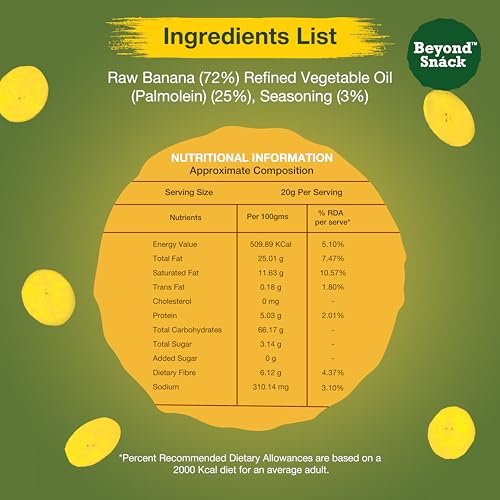 • Serving Suggestions: Perfect for tea breaks binge-watching your favorite TV shows or cricket matches or as a great accompaniment in your kids' tiffin. The all-new Beyond Snack Kerala Banana Chips should be your latest addition to your favorite snacking ch