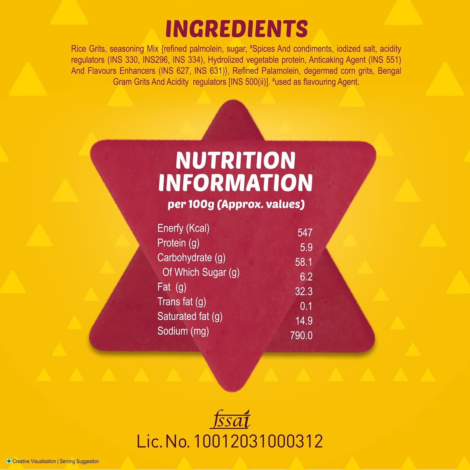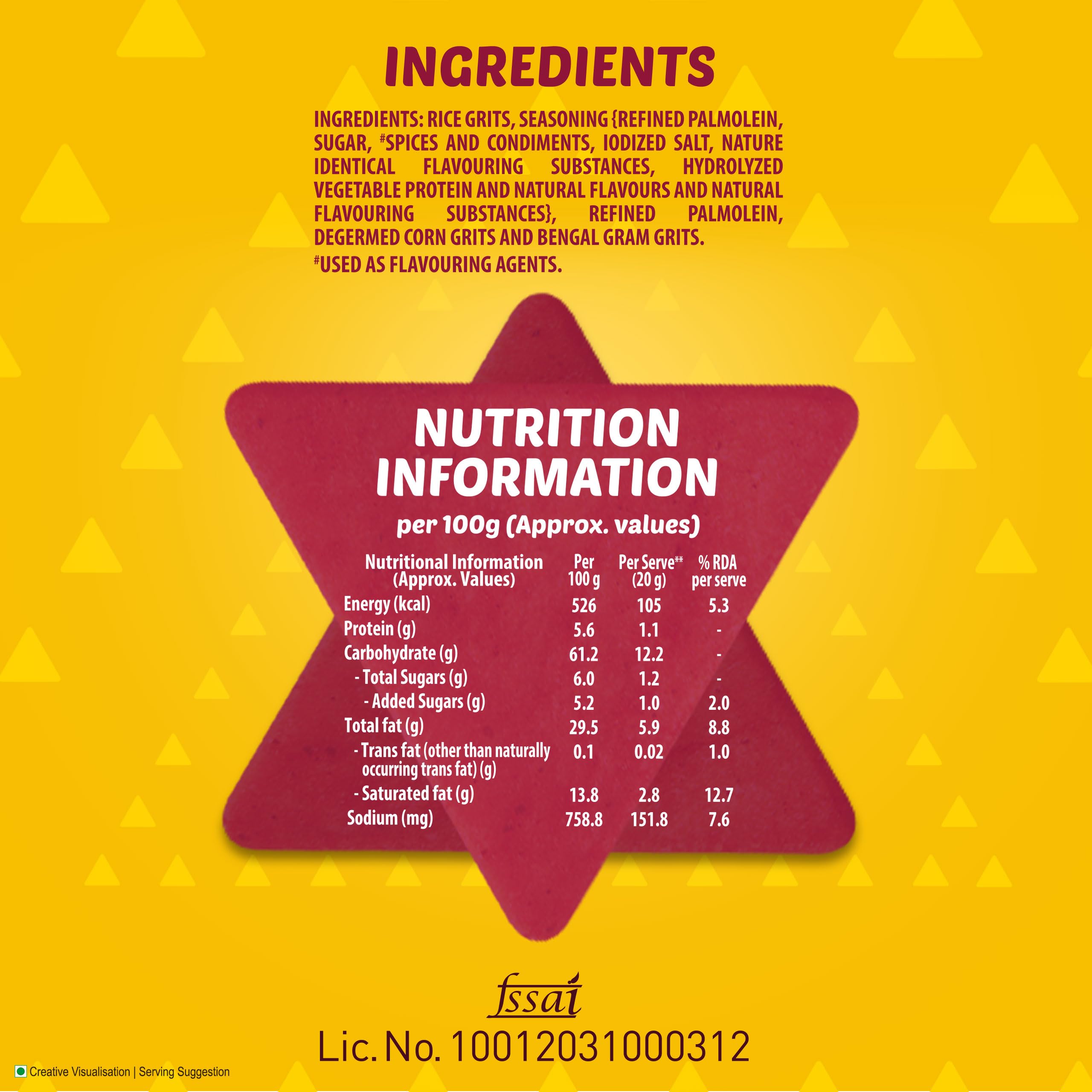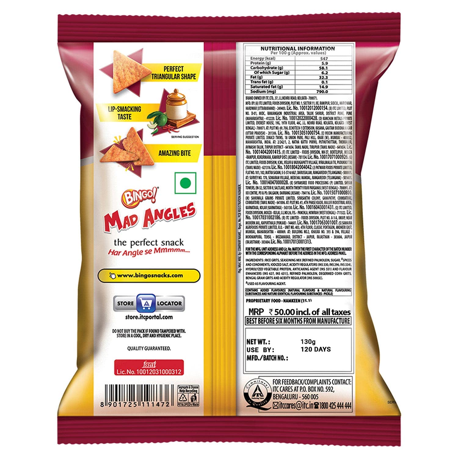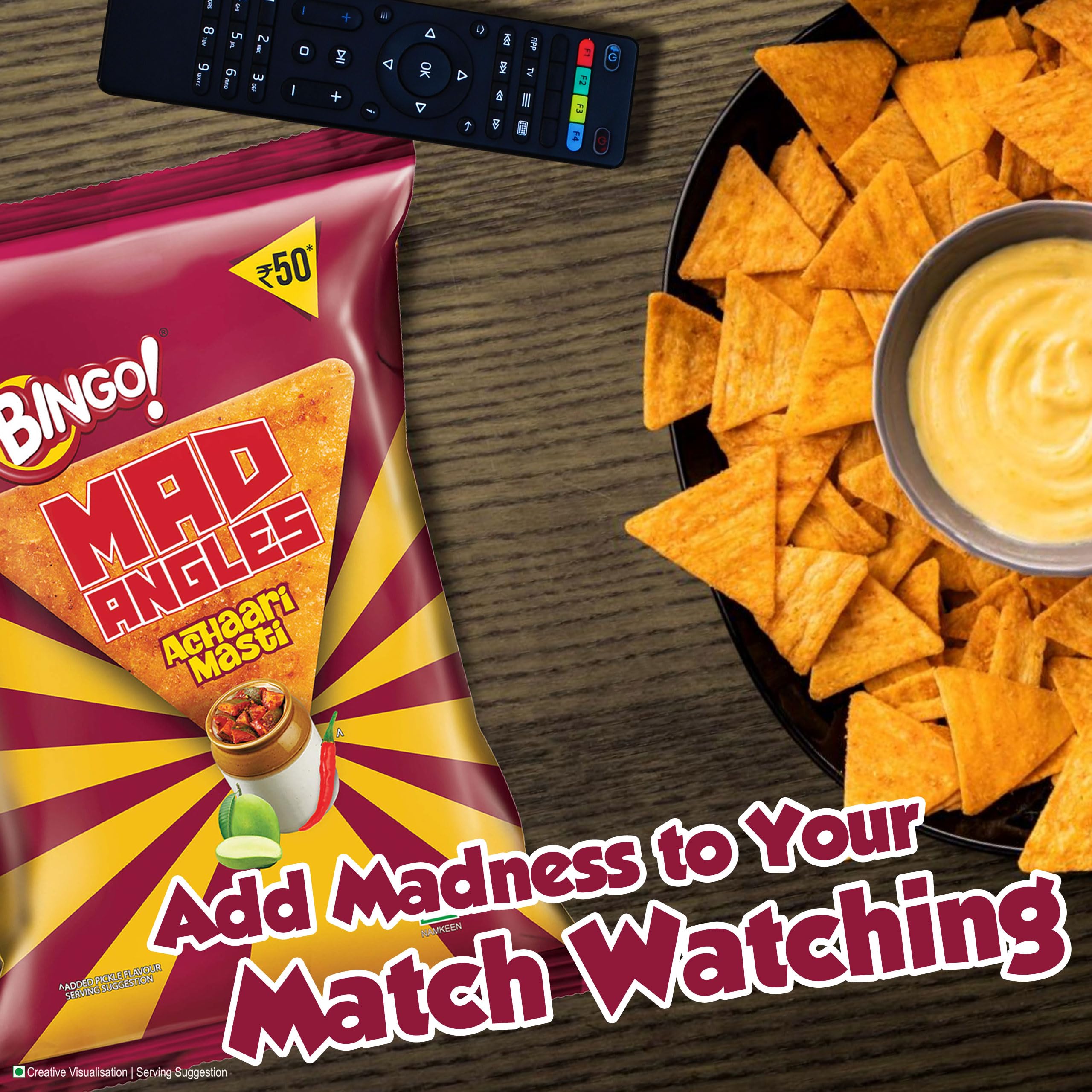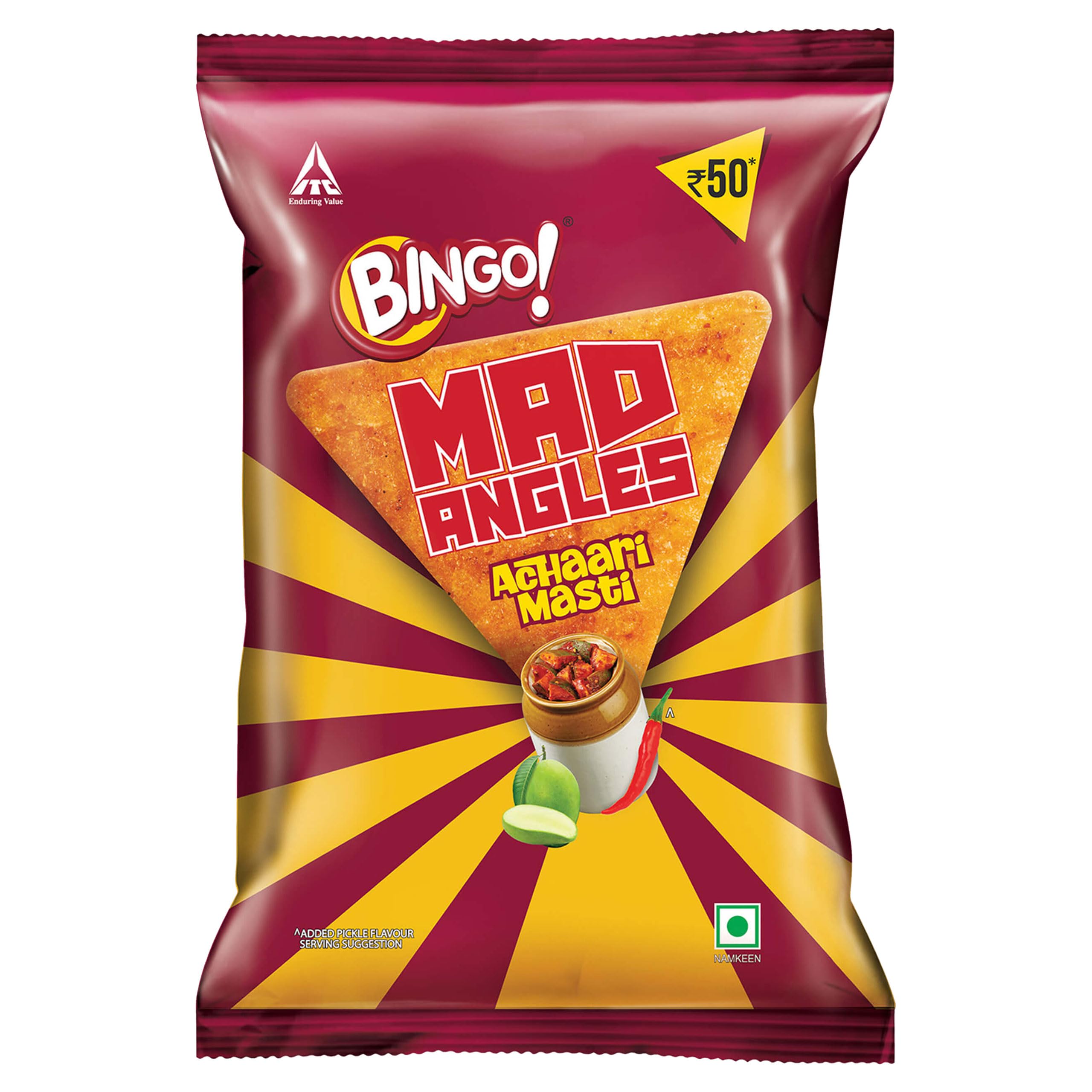 Want to try something different from the regular chips? How about some crunchy chips with the yummy flavour of mango pickles? Get home a pack of Bingo! Mad Angles Achaari Masti. A triangle chip made from a corn base and cooked with rice and flour. The authentic taste of achaar is added which gives a delightful taste to the uniquely textured crunchy chips. Reminiscent of your Dadis mango pickles stored in a white and brown ceramic 'barni' the taste of Achaari Masti will transport you to those good old days with each bite. Bingo! Mad Angles takes the joy of having achaar and has turned it into fun and delicious triangle chips. Dig in the pack of this desi flavoured Mad Angles and satisfy your snack cravings anytime anywhere. Whether youre bored in a meeting waiting for your favourite team to score the winning goal or having a party. They are just incomplete without a bag of Bingo! Mad Angles by your side.